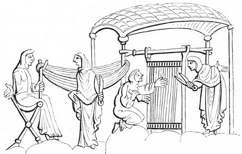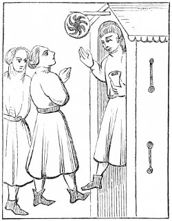 In Beowulf, the sleeping-rooms of Hrothgar and his court seem to have been so completely detached from the hall, that their inmates did not hear the combat that was going on in the latter building at night. In smaller houses the sleeping-rooms were fewer, or none, until we arrive at the simple room in which the inmates had board and lodging together, with a mere hedge for its inclosure, the prototype of our ordinary cottage and garden. The wall served for a defence against robbers and enemies, while, in times of peace and tranquillity, it was a protection from indiscreet intruders, for the doors of the hall and chambers seem to have been generally left open. Beggars assembled round the door of the wall—the ostium domûs—to wait for alms.