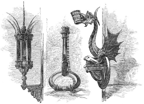 The vocabularies of the Anglo-Saxon period furnish us with the names of most of the parts of the ordinary dwellings. The entrance through the outer wall into the court, the strength of which is alluded to in early writers, was properly the gate (geát). The whole mass inclosed within this wall constituted the burh (burgh), or tun, and the inclosed 12 court itself seems to have been designated as the cafer-tun, or inburh. The wall of the hall, or of the internal buildings in general, was called a wag, or wah, a distinctive word which remained in use till a late period in the English language, and seems to have been lost partly through the similarity of sound.1 The entrance to the hall, or to the other buildings in the interior, was the duru, or door, which was thus distinguished from the gate. Another kind of door mentioned in the vocabularies was a hlid-gata, literally a gate with a lid or cover, which was perhaps, however, a word merely invented to represent the Latin valva, which is given as its equivalent. The door is described in Beowulf as being “fastened with fire-bands” (fyr-bendum fæst, I. 1448), which must mean iron bars.2 Either before the door of the hall, or between the door and the interior apartment, was sometimes a selde, literally a shed, but perhaps we might now call it a portico. The different parts of the architectural structure of the hall enumerated in the vocabularies are stapul, a post or log set in the ground; stipere, a pillar; beam, a beam; ræfter, a rafter; læta, a lath; swer, a column. The columns supported bigels, an arch or vault, or fyrst, the interior of the roof, the ceiling. The hrof, or roof, was called also thecen, or thæcen, a word derived from the verb theccan, to cover; but although this is the original of our modern word thatch, our readers must not suppose that the Anglo-Saxon thæcen meant what we call a thatched roof, for we have the Anglo-Saxon word thæc-tigel, a thatch-tile, as well as hrof-tigel, a roof-tile. There was sometimes one story above the ground-floor, for which the vocabularies give the Latin word solarium, the origin of the later mediæval word, soler; but it is evident that this 13 was not common to Anglo-Saxon houses, and the only name for it was up-flor, an upper floor. It was approached by a stæger, so named from the verb stigan, to ascend, and the origin of our modern word stair. There were windows to the hall, which were probably improvements upon the ruder primitive Saxon buildings, for the only Anglo-Saxon words for a window are eag-thyrl, an eye-hole, and eag-duru, an eye-door.