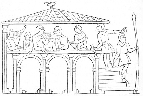 These few epithets and allusions, scattered through the poem, give us a tolerable notion of what the house of a Saxon chieftain must have been in the country from whence our ancestors came, as well as afterwards in 3 that where they finally settled. The romantic story is taken up more with imaginary combats with monsters, than with domestic scenes, but it contains a few incidents of private life. The hall of king Hrothgar was visited by a monster named Grendel, who came at night to prey upon its inhabitants; and it was Beowulf’s mission to free them from this nocturnal scourge. By direction of the primeval coast-guards, he and his men proceeded by the “street” already mentioned to the hall of Hrothgar, at the entrance to which they laid aside their armour and left their weapons. Beowulf found the chief and his followers drinking their ale and mead, and made known the object of his journey. “Then,” says the poem, “there was for the sons of the Geats (Beowulf and his followers), altogether, a bench cleared in the beer-hall; there the bold of spirit, free from quarrel, went to sit; the thane observed his office, he that in his hand bare the twisted ale-cup; he poured the bright sweet liquor; meanwhile the poet sang serene in Heorot (the name of Hrothgar’s palace), there was joy of heroes.” Thus the company passed their time, listening to the bard, boasting of their exploits, and telling their stories, until Wealtheow, Hrothgar’s queen, entered and “greeted the men in the hall.” She now served the liquor, offering the cup first to her husband, and then to the rest of the guests, after which she seated herself by Hrothgar, and the festivities continued till it was time to retire to bed. Beowulf and his followers were left to sleep in the hall—“the wine-hall, the treasure-house of men, variegated with vessels” (fættum fáhne). Grendel came in the night, and after a dreadful combat received his death-wound from Beowulf. The noise in the hall was great; “a fearful terror fell on the North Danes, on each of those who from the walls heard the outcry.” These were the watchmen stationed on the wall forming the chieftain’s palace, that enclosed the whole mass of buildings (of wealle).