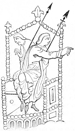 It came into the mind of Hrothgar, we are told, that he would cause to be built a house, “a great mead-hall,” which was to be his chief palace, or metropolis. The hall-gate, we are informed, rose aloft, “high and curved with pinnacles” (heáh and horn-geáp). It is elsewhere described as a “lofty house;” the hall was high; it was “fast within and without, with iron bonds, forged cunningly;” it appears that there were steps to it, and the roof is described as being variegated with gold; the walls were covered with tapestry (web æfter wagum), which also was “variegated with gold,” and presented to the view “many a wondrous sight to every one that looketh upon such.” The walls appear to have been of wood; we are repeatedly told that the roof was carved and lofty; the floor is described as being variegated (probably a tesselated pavement); and the seats were benches arranged round it, with the exception of Hrothgar’s chair or throne. In the vicinity of the hall stood the chambers or bowers, in which there were beds (bed æfter búrum).