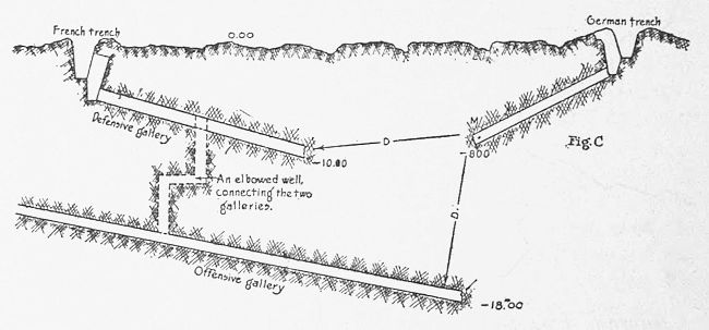 In sectors where the distance between the two lines is below 150 meters, mine warfare must be used. When the trenches are farther apart, underground warfare is seldom employed. In special cases, however, when there are strong ventilators and the line is stable enough to permit of it, advance may be made underground.