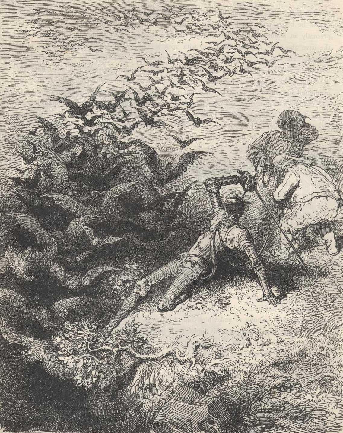 At the sound of his piteous cry and of the stroke of the cruel lash, Don Quixote ran to him at once, and seizing the twisted halter that served him for a courbash, said to him, “Heaven forbid, Sancho my friend, that to please me thou shouldst lose thy life, which is needed for the support of thy wife and children; let Dulcinea wait for a better opportunity, and I will content myself with a hope soon to be realised, and have patience until thou hast gained fresh strength so as to finish off this business to the satisfaction of everybody.”