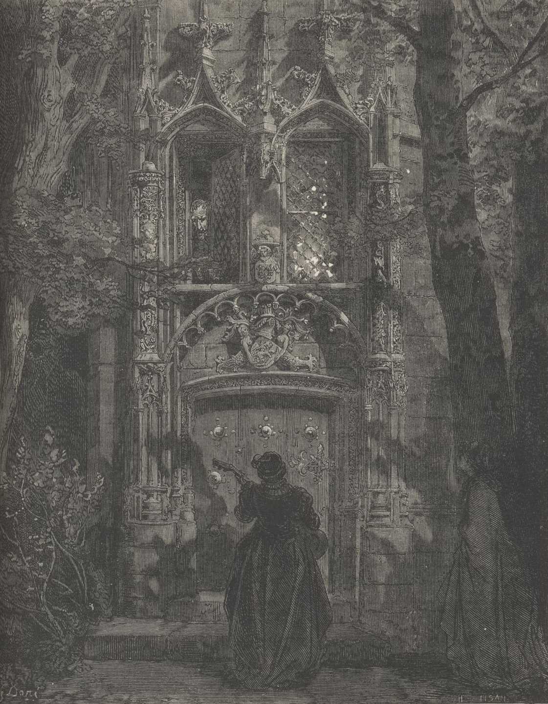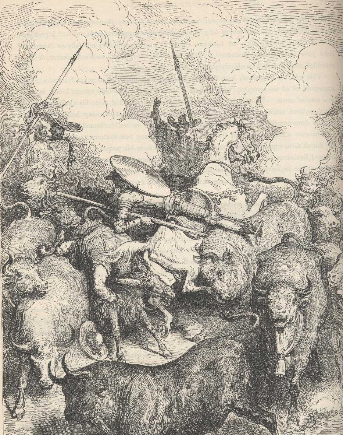 The book cover and spine above and the images which follow were not part of the original Ormsby translation—they are taken from the 1880 edition of J. W. Clark, illustrated by Gustave Dore. Clark in his edition states that, “The English text of ‘Don Quixote’ adopted in this edition is that of Jarvis, with occasional corrections from Motteaux.” See in the introduction below John Ormsby’s critique of both the Jarvis and Motteaux translations. It has been elected in the present Project Gutenberg edition to attach the famous engravings of Gustave Dore to the Ormsby translation instead of the Jarvis/Motteaux. The detail of many of the Dore engravings can be fully appreciated only by utilizing the “Enlarge” button to expand them to their original dimensions. Ormsby in his Preface has criticized the fanciful nature of Dore’s illustrations; others feel these woodcuts and steel engravings well match Quixote’s dreams. D.W.