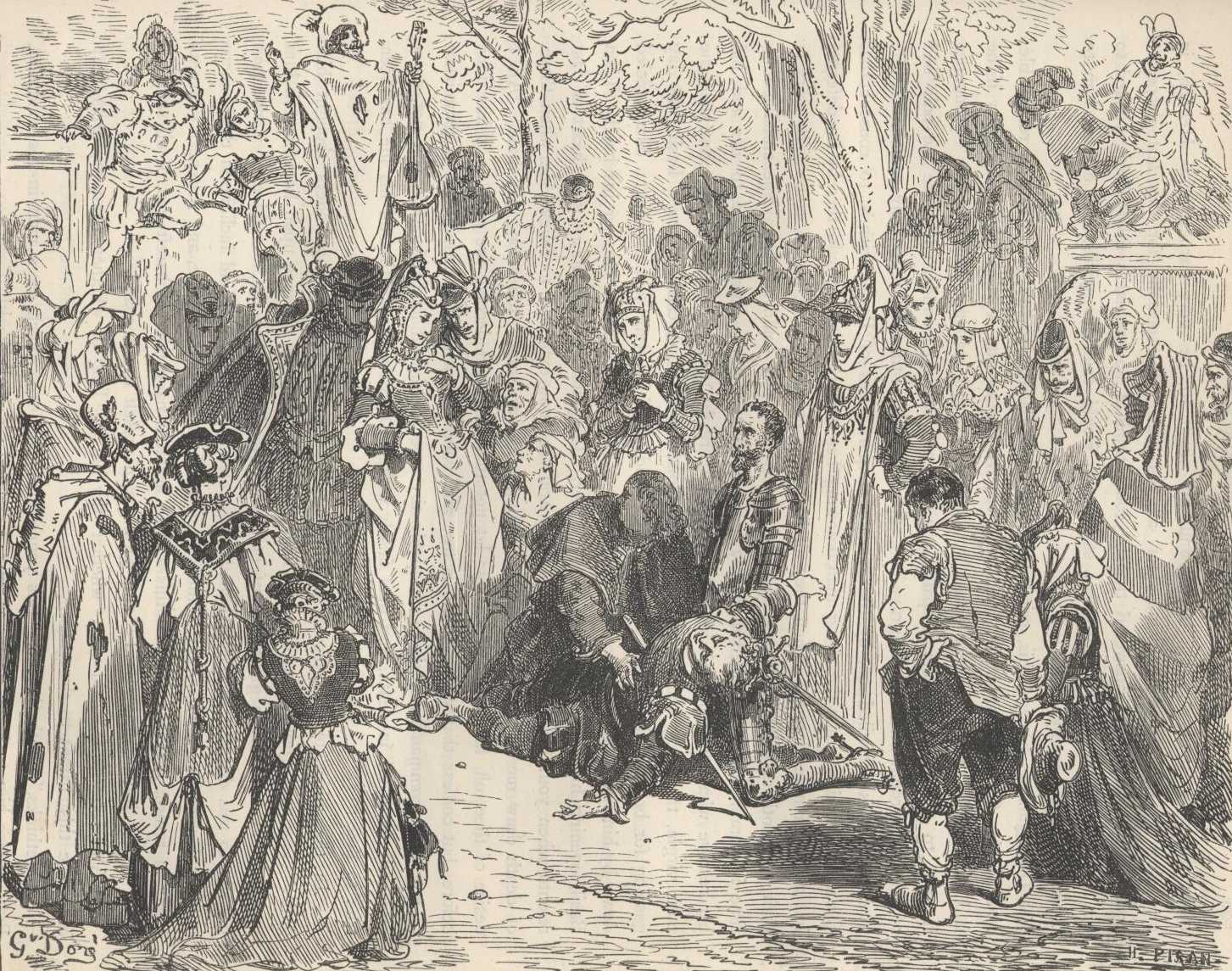 His friends at once ran to his aid, filled with grief at his misery and sad fate, and Don Quixote, dismounting from Rocinante, hastened to support him, and took him in his arms, and found he had not yet ceased to breathe. They were about to draw out the rapier, but the priest who was standing by objected to its being withdrawn before he had confessed him, as the instant of its withdrawal would be that of this death. Basilio, however, reviving slightly, said in a weak voice, as though in pain, "If thou wouldst consent, cruel Quiteria, to give me thy hand as my bride in this last fatal moment, I might still hope that my rashness would find pardon, as by its means I attained the bliss of being thine."