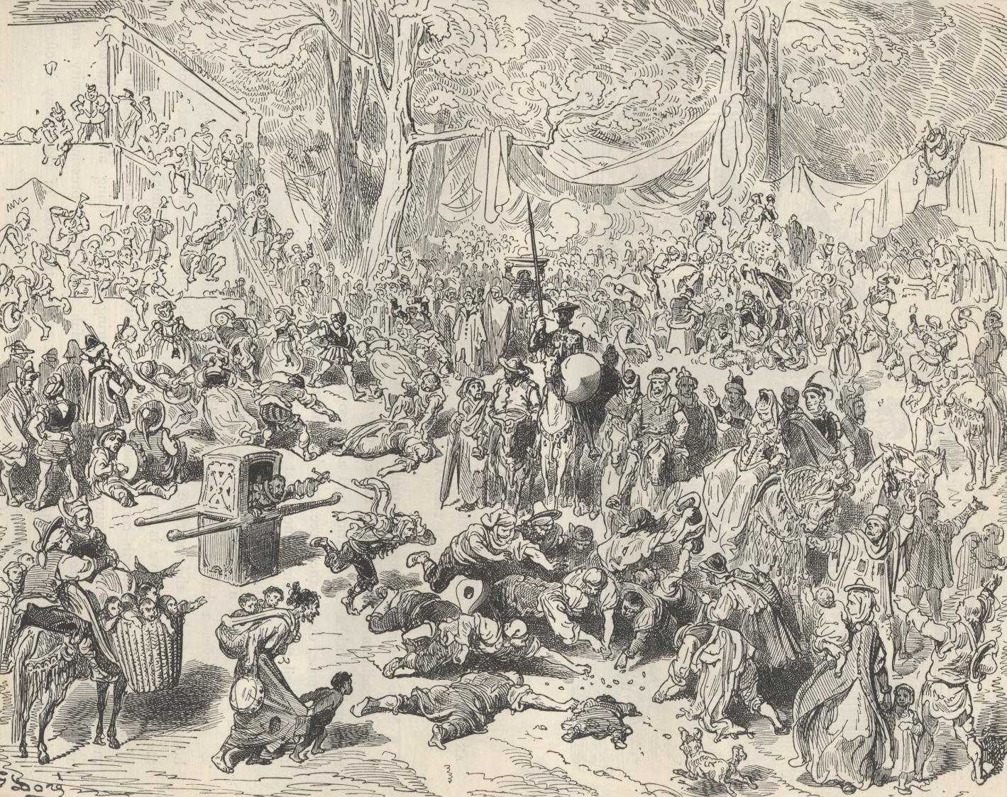 While Don Quixote and Sancho were engaged in the discussion set forth the last chapter, they heard loud shouts and a great noise, which were uttered and made by the men on the mares as they went at full gallop, shouting, to receive the bride and bridegroom, who were approaching with musical instruments and pageantry of all sorts around them, and accompanied by the priest and the relatives of both, and all the most distinguished people of the surrounding villages. When Sancho saw the bride, he exclaimed, "By my faith, she is not dressed like a country girl, but like some fine court lady; egad, as well as I can make out, the patena she wears rich coral, and her green Cuenca stuff is thirty-pile velvet; and then the white linen trimming—by my oath, but it's satin! Look at her hands—jet rings on them! May I never have luck if they're not gold rings, and real gold, and set with pearls as white as a curdled milk, and every one of them worth an eye of one's head! Whoreson baggage, what hair she has! if it's not a wig, I never saw longer or fairer all the days of my life. See how bravely she bears herself—and her shape! Wouldn't you say she was like a walking palm tree loaded with clusters of dates? for the trinkets she has hanging from her hair and neck look just like them. I swear in my heart she is a brave lass, and fit 'to pass over the banks of Flanders.'"
