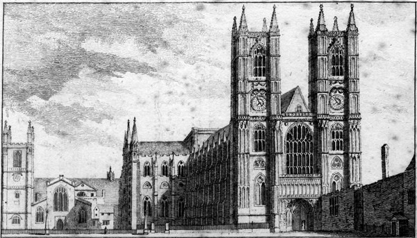 This venerable fabric has been accordingly new coated on the outside, except that part called Henry the Seventh’s chapel, which is indeed a separate building: and the west end has been adorned with two new stately towers that have been lately rebuilt, in such a manner as to be thought equal in point of workmanship to any part of the ancient building; but though such pains have been taken in the coating, to preserve the ancient Gothic grandeur, that this church in its distant prospect has all the venerable majesty of its former state, yet the beautiful carving with which it was once adorned, is irretrievably lost; the buttresses, once capped with turrets, are now made in plain pyramidical forms, and topped with freestone; and the statues of our ancient Kings that formerly stood in niches, near the tops of those buttresses, are for the most part removed, and their broken fragments lodged in the roof of Henry the Seventh’s chapel. Three of these statues are still standing next the towers on the north side, and indeed that is the only side where you can take a view of the Abbey, the other side being so incumbered with buildings, that even its situation cannot be distinguished.