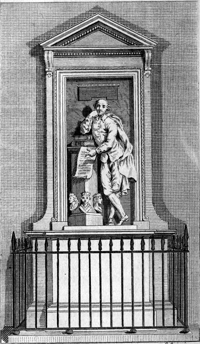 Next to this is a monument erected to the memory of Col. Edward Popham, and his Lady, whose statues in white marble stand under a lofty canopy, resting their arms in a thoughtful posture upon a marble altar, on which lie the gloves of an armed knight. This gentleman was an active officer in Cromwell’s army, and his atchievements were here inscribed on his tomb. Upon the restoration, the monument was ordered to be demolished, and the inscription erased; but at the intercession of some of his Lady’s relations, who had eminently served his Majesty, the stone whereon the inscription was cut was only turned inwards, and no other injury done to his monument.
