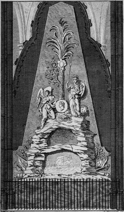 Close to the wall is a monument of Sir George Hollis, nephew to Sir Francis Vere, and a Major General under him. On the pedestal is represented the siege of a town in relief, where the principal figure is a General on horseback holding a battoon, and having one eye blemished, perhaps alluding to the siege of Newport, in which Sir George also gained great honour, and had a horse killed under him. On each side of this pedestal sits a Pallas, lamenting the death of the great warrior, who is represented above in the Roman habit, standing erect upon a lofty altar, with a cherub supporting the plinth on which he stands. Sir George died in January 1626. An ingenious author speaking of this monument, says, that Sir George was the first erect figure set up in the Abbey; “an attitude, says he, which I am far from discommending, for ’tis my opinion, statues should always represent life and action: ’tis peculiarly adapted to heroes, who ought never to be supposed at rest, and should have their characters represented as strong as possible: this before us is bold and manly, though not chaste and elegant: ’tis finely elevated too, and the mourning Pallases, at the base of it, are both well fancied and well applied.”