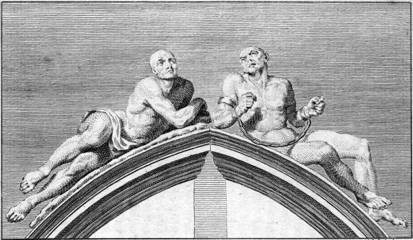 The other is the tomb of Sir Christopher Hatton, son to Christopher Hatton, Lord Chancellor of England. The principal figures are a knight in armour, and a lady in deep mourning resting on the ascending sides of a triangular pediment, parted in the middle by a trunkless helmet. Over their heads is a neat piece of architecture, in the center of which is a scroll with their arms, held up by naked boys, one of whom holds an extinguished torch reversed over the Knight, to shew that Sir Christopher died first; the other over the Lady holds his torch upright and burning, to signify that she survived him. The inscription informs us, that Sir Christopher died on the 10th of September 1619.