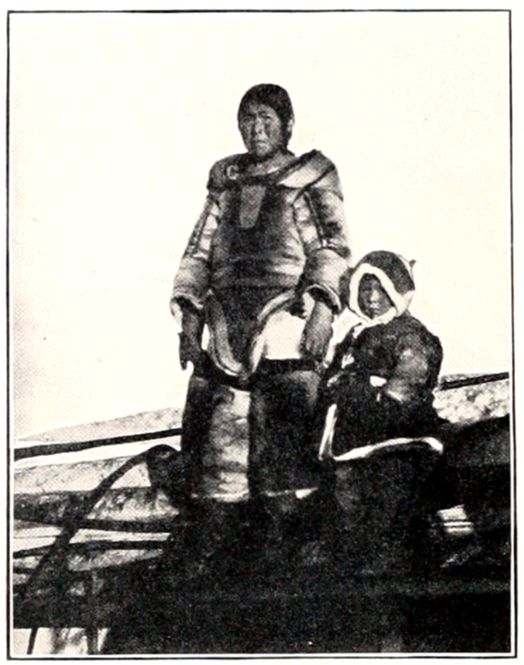 One man brought his family close to where the ship lay, that AH-NI-GHI´-TO might see what fine children he had. The little girl, a child of three years, had on short, white leather kamiks (boots) with long seal-skin stockings coming to the thigh, but the tops of the stockings above the boots were covered with snow-white, lace-trimmed pantalettes made of muslin. Her little seal-skin trousers had bands of white leather embroidered in red, down the front of each leg, and her top garment made like a sweater, was of red and white figured calico, trimmed about the neck and wrists with black 30fur and lined with the soft, warm breasts of the eider duck. The baby was dressed very much like the babies at home, only the feet and legs were put into a fur bag covered with bright calico.