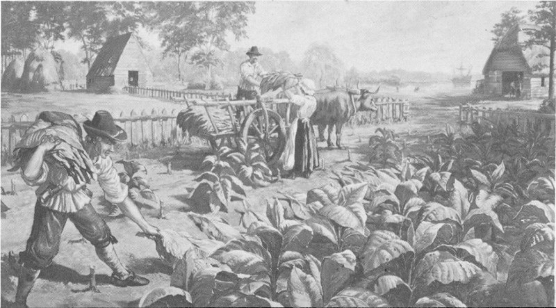 Tobacco cultivation as practiced at Jamestown. (A conjectural painting by Sidney E. King.)