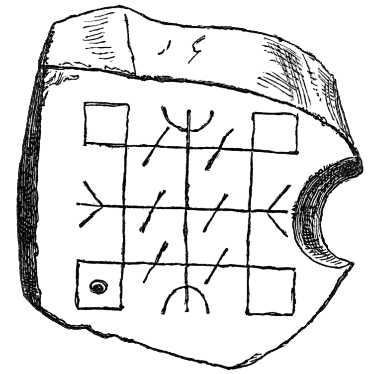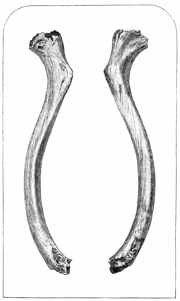 The weapons, which date from A.D. 1050 to 1400, are represented by old spears and halberts. A good imitation Toledo blade, with sunk midrib; daggers and battle-axes, one of which was taken from under a heap of stones in the Vestmannaeyjar; chain armour, and a variety of large and small Bigones (hones), of smooth compact basalt, for cleaning and sharpening weapons. A saddle cloth, hanging against the wall, shows figures of various animals, tolerable tambour work, in the Persian style. There is a collection of iron, wooden, and bone stirrups, and sundry prick-spurs. The cups are interesting; and one of them, probably intended for a man and his wife, contains at least a quart bottle. The finest are made of walrus teeth (Rostungr, Trichecus rosmarus), the animal being often cast ashore in the north: poorer specimens are of horn. Here we find the material for the Guma Minni, or memorial bowls; the Guðfödurs Minni, or cup quaffed to God the Father; the Heilags Anda Minni, to the Holy Ghost; the toast to the Archangel Michael, a fighter like old Thor; the Mariu Minni, of the Blessed Virgin; and the Marteinn’s Minni, to Martin (Turonensis). The snuff-boxes are unlike the horns now used: one is an oval, with an upper plate of ivory and wood below, hooped round with brass, and containing a cullender, probably used for pulverising the leaf. Mangling seems to have been a favourite occupation; the hand articles (Kefli) are found in numbers: the roller is smooth; the upper stick is carved, and gaudily painted;[14] and the étuis are as numerous{18} as the mangles. One case containing bobbins is fastened to an embroidery cushion; another bears date 1677. Some hold horn spoons, others razors, others buttons, and all are shaped like the inkstands of the East, and curiously but artlessly carved. There is a coarse plane for the carpenter. The weaver of rude cloth worked his sword-shaped shuttle of polished bone, yielded by the whale, whose ribs also supplied rafters, more expensive but more durable than wood. The mammal gave material for dice and draughtsmen played at Kotra (tables), and these are the nearest approaches to the “chessmen made of fish bones,” mentioned in old books. There is a specimen of the Langspiel (violin), and its horsehair bow, formerly so well known in the Scoto-Scandinavian islands.[15] This instrument has three pegs for strings, and seventeen frets, but no bridge: possibly it was played with the thumb, as the Barber of Seville is still wont to do. Uno Von Troil supplies it (p. 92) with six brass wires, acting strings; but I do not understand what his “symphon” is. Mackenzie sketches it, but shows the side instead of the face; and Hooker, drawing it from memory, draws it incorrectly.
