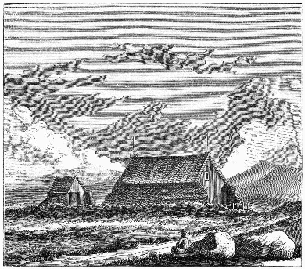 We then proceeded to the College Library, a detached building of solid construction, but suffering sadly from damp accumulating in the porous stone. In the big bluewashed room fires are neglected, consequently the books are damp and mildewed.[7] At the bottom,{9} above a broken globe, is a votive tablet erected to an English benefactor, Charles Kellsall of London, who supplied funds for the building, and who left it a library, which, they say, has not yet begun its journey Icelandwards: there is none to Mr John Heath, who printed the Rev. Jón Thorlaksson’s well-known Eddaic paraphrase of “Paradise Lost,” and to whom the Icelandic Literary Society owes a heavy debt of gratitude.
