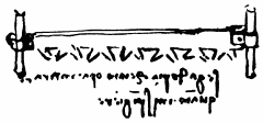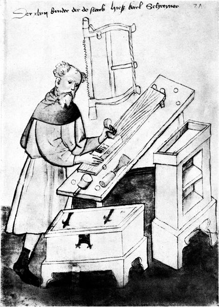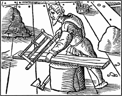 Eine einzähnige Säge wird uns ums Jahr 1100 von einem Mönch Namens Theophilus beschrieben, der ein umfangreiches Buch mit Anweisungen für die Herstellung aller möglichen kirchlichen Geräte verfaßte. In dem Abschnitt über das Tauschieren beschreibt Theophilus eine Maschine, die ich hier mit aller Vorsicht rekonstruiert habe. Beim Tauschieren ritzt man das zu verzierende Eisen nach einer aufgetragenen Zeichnung ein und hämmert in dieser Ritz silberne oder goldene Fäden. Der Ritz muß möglichst gleichmäßig werden, sonst wird die Verzierung unansehnlich.