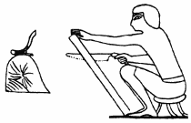 Rechts hockt der Mann, der mit der linken Hand ein Brett hält und es mit der bronzenen Säge zersägt. Links sägt ein Mann stehend. Das Brett ist hier an einem kürzeren Pfahl angebunden. In der Bindung steckt ein Hebel, der durch einen, an einem Seil hängenden Stein beschwert ist. Hier ist die Darstellung wohl ungenau, denn der Stein würde den Sägeschnitt zusammenpressen. Vermutlich müssen zwei verschiedene Bindungen vorhanden gewesen sein. Die eine hielt das Brett an einem Pfahl fest, während die andere den kleinen Hebel hielt. Dieser war wohl am unteren Ende zugespitzt, steckte mit dieser Schneide im Sägeschnitt und öffnete ihn beim Fortschreiten der Säge immer mehr. Auch auf anderen ägyptischen Darstellungen ist der sägende Holzarbeiter zu sehen, so z. B. auf Seite 9, die eine Malerei aus dem Grab des Rekhmara von etwa 1450 v. Chr. zeigt.[7]