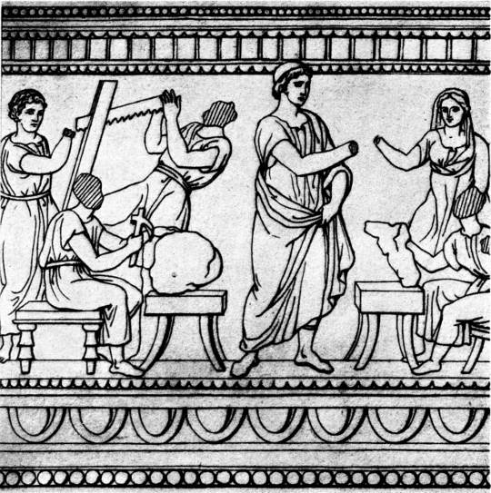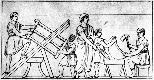 Betrachten wir die Darstellungen von Sägen auf Bildwerken des Altertums, dann dürfen wir nicht allzuviel technische Kritik aufwenden, denn der Künstler ging damals — und geht noch heute — bei der Gestaltung realer Dinge von ästhetischen Gesichtspunkten aus. Und dann müssen wir beachten, daß die feinen Einzelheiten einer Säge, zumal die Zahnform, auf bildlichen Darstellungen leicht verloren gehen und auch von den Altertumsforschern, die die antiken Denkmäler ehemals abzeichneten, wohl nicht allzu sorgsam wiedergegeben worden sind.