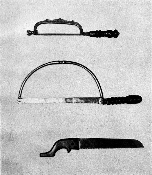 Die Bronzesäge ging auch in den griechischen Kulturkreis über. Auf Seite 12 ist eine feine, bronzene Knochensäge mit angegossenem Griff abgebildet, wie sie ums Jahr 200 v. Chr. von griechischen Ärzten bei[S. 12] Amputationen benutzt wurde. Die ganze Länge dieses zu Ephesos gefundenen Stückes mißt 205 mm[9].