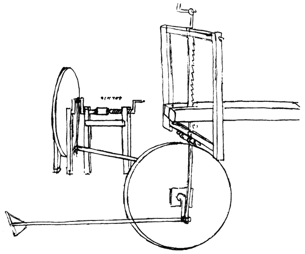 Theophilus sagt[25]:.... ».... Wenn du also das Eisen bearbeitet und daraus Sporen oder andere Gerätschaften .... gemacht hast und sie mit Gold oder Silber schmücken willst, so nimm reinstes Silber und mache[S. 23] es durch Hämmern sehr dünn.« Theophilus spricht also hier von der Verzierung durch Tauschieren. Man muß zur Anbringung der dünnen Silberstreifen Einschnitte in das Eisen machen. Dies soll mittels folgender Maschine geschehen: »Dann habe eine Maschine aus Eichenholz, einen Fuß im Durchmesser und gedrechselt. Sie sei am Umfang dünn und in der Mitte auf jeder Seite dicker, hier sei ihr ein anderes gekrümmtes Holz, daran sie sich drehen läßt, durchgesteckt. Diesem sei an einem Ende ein anderes gebogenes Stück Holz angefügt, mit welchem (das Ganze) herum bewegt wird. Hast du dieses Rad nun zwischen zwei Säulen gestellt, so mache an dem Umfang desselben Einschnitte gleich Stufen, die nach rückwärts gekehrt sind. Die Säulen, zwischen denen das Rad liegt, seien fest und der Breite nach am Gestell befestigt, so daß das gekrümmte Holz zur Rechten stehe. Noch befinde sich zur Linken vorn neben dem Rad eine Säule, an der ein dünnes Holz angebracht sei, und zwar so, daß es auf das Rad zu liegen komme, und es habe an der Spitze ein dünnes Stück Stahl, so lang und breit, wie der Nagel eines Daumens. Dies (Stück Stahl sei) in einem Loch fest eingefügt und sehr scharf, sodaß bei der Umdrehung des Rades, während das Holz immer von Stufe zu Stufe fällt, der so in zuckende Bewegung gebrachte Stahl, was in seine Nähe gebracht wird, schneidet (incidat). Wenn du nun einen Sporn.... hast, so stelle ihn auf brennende Kohlen, bis er schwarz wird, wenn er kalt wurde, halte ihn in der Linken und drehe das Rad mit der Rechten, nähere ihn dem Stahl, schneide mit Sorgfalt überall....« Unklar ist die Textstelle von Theophilus nur dort, wo er zum zweiten Mal von einem gekrümmten Holz spricht. Mindestens ist die zweite Krümmung nicht notwendig, und ich habe sie deshalb in der Rekonstruktion durch einen geraden Kurbelgriff ersetzt.