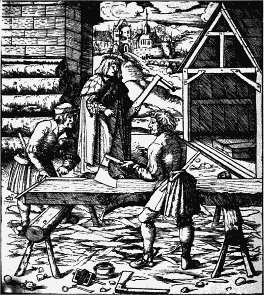 Ein Vergleich mit der Preisliste einer heutigen französischen Sägen-Fabrik ergab, daß diese Form der Säge noch in Frankreich zu finden ist. Es ist beachtenswert, wie sich die Formen der Werkzeuge oft Jahrhunderte lang unverändert erhalten. Rechts im Vordergrunde sehen wir neben dem Mann, der ein Loch in das Gebälk bohrt, eine der im Mittelalter beliebt gewesenen schwertförmigen Stichsägen. Bei diesen Sägen stehen die Zähne immer auf Stoß und die Zahnkante ist bauchig. Der Griff ist so lang, daß er mit beiden Händen erfaßt werden kann. Griff und Sägeblatt sind durch einen runden Schutzteller von einander getrennt.
