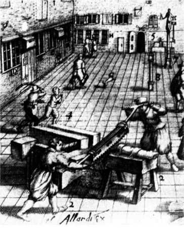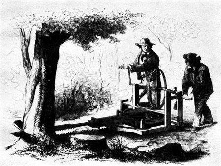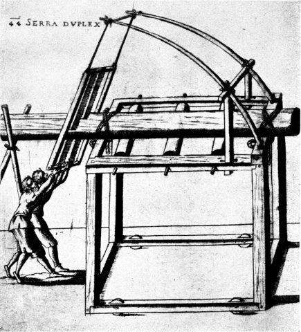Auf zwei Böcken liegt ein schweres Bord, das von zwei Mann zersägt wird. Beachtenswert sind an der hier abgebildeten Säge die beiden voneinander verschiedenen Handgriffe. Der obere sitzt an zwei schräg stehenden Eisen in der Verlängerung des Rahmens, der untere auf dem Querholz des Rahmens.
