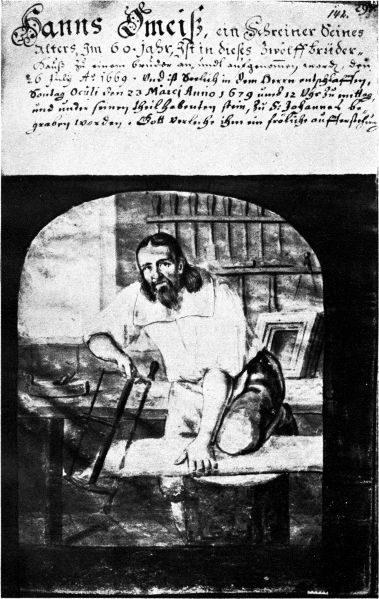 Ums Jahr 1398 wurde im Mendelschen Stiftungsbuch der 47. Bruder der Stiftung, Karl Schreyner, porträtiert (Seite 27). Wir sehen ihn an einer der damals gebräuchlichen sehr einfachen Hobelbänke bei der Arbeit. Die Bank hat noch keine Schraubklemmen, sondern nur Löcher zum Einschlagen hölzerner Bankpflöcke. Im Vordergrund steht eine Truhe[S. 28] und daneben ein kleiner Schrank. An der Wand der Werkstätte hängt eine schön geschweifte Rahmensäge.