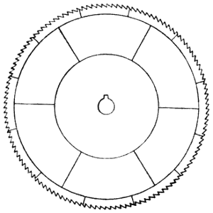 Ein selbsttätig arbeitendes Sägewerk mit Wasserkraft wird von dem um 1245 wirkenden französischen Ingenieur Wilars entworfen (unten). Bei der Skizze steht nur vermerkt: »Auf diese Art macht man eine Säge, um selbsttätig zu sägen.« Um die Skizze besser verständlich zu machen,[S. 25] habe ich Buchstaben eingefügt: a stellt den Bach dar, der das unterschlägige Wasserrad b treibt, auf dessen Wellbaum die vier Daumen c sitzen. Diese drücken die Hebel d und mit ihnen die Säge e nieder, die durch den federnden Baum f wieder hochgezogen wird, g ist der in den Führungen h gleitende Balken, den das Zackenrad i gegen die Säge vorschiebt.