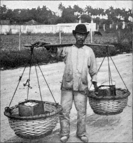 Die chinesischen Kulis, deren Zahl sich zur Zeit etwa auf 50000 (gegen 3 Prozent der Gesamtbevölkerung) beläuft, haben den Zweck, zu dem sie seit 1847 eingeführt worden sind, im allgemeinen gut erfüllt und sich in den Zuckerrohrpflanzungen und Zuckerfabriken als geschickte und fleißige Arbeiter bewiesen, so daß das Fortblühen des wichtigsten cubanischen Wirtschaftszweiges ihnen in sehr bemerkenswertem Maße mit zu verdanken ist. Reichtümer haben sie aber unter den obwaltenden Verhältnissen als Plantagenarbeiter ebensowenig gesammelt als in anderen Geschäftsbetrieben, denen sie sich nach Ablauf ihres Kontraktes etwa zuwandten — als Handwerker, Gemüsegärtner, Straßenverkäufer (Abb. 24) u. s. w. —, und zu dem cubanischen Proletariate stellen sie eine auffällig große Anzahl der allerelendesten und beklagenswertesten Bettlerfiguren. Loyalität dem spanischen Regiment gegenüber war natürlich von ihnen noch weniger zu erwarten als von den Negern, Mulatten und Creolen, und da sie in politischer Beziehung einfach mit dem Strome schwimmen, so sind sie auch in dem Insurgentenheere verhältnismäßig stark vertreten gewesen, zwar nicht unter den Kämpfern, wohl aber unter den Köchen, Trägern und dergleichen.