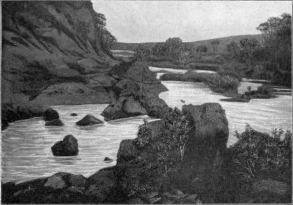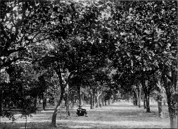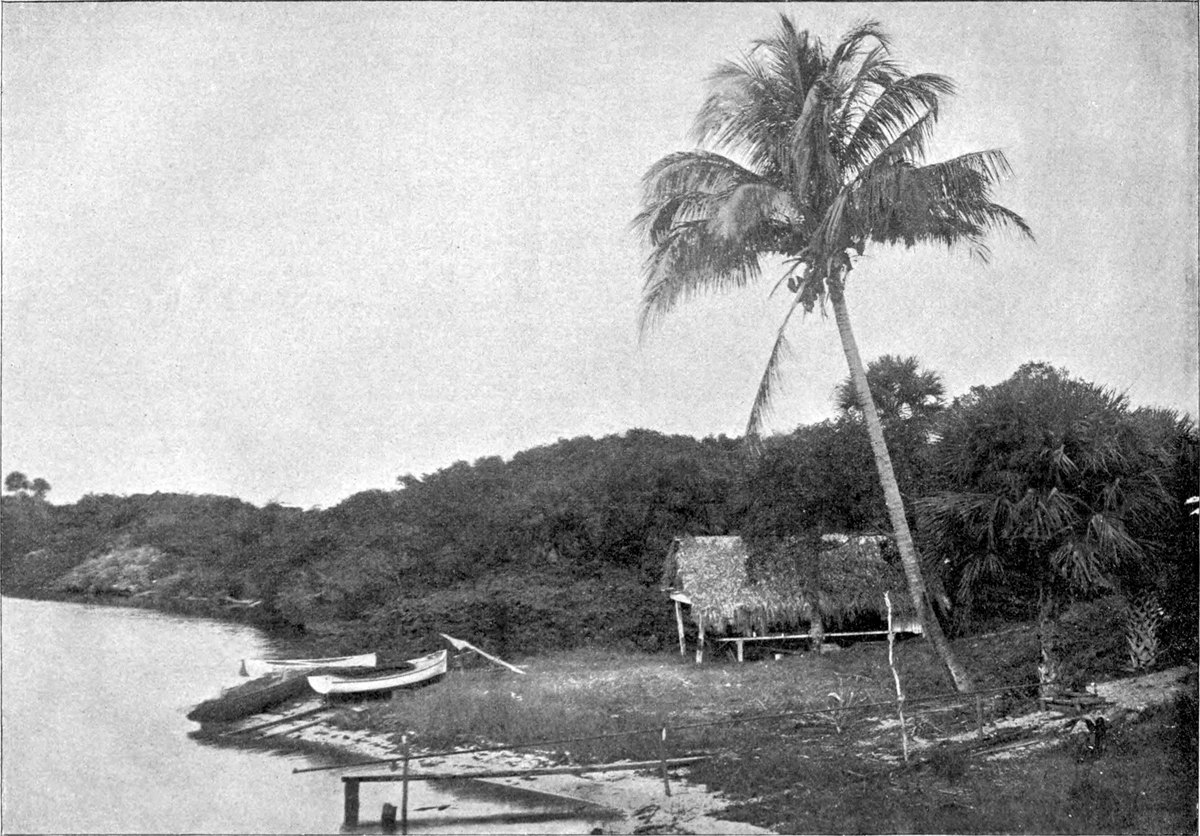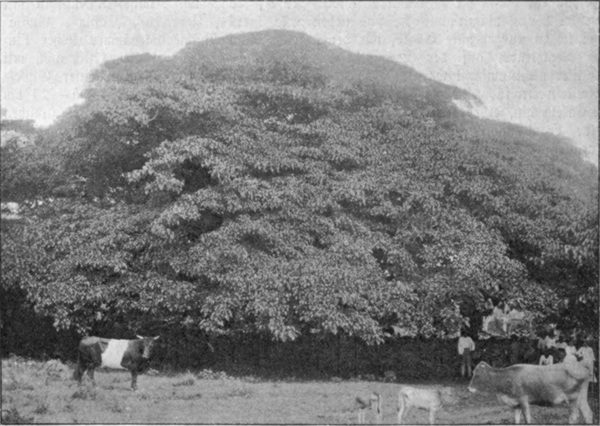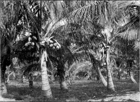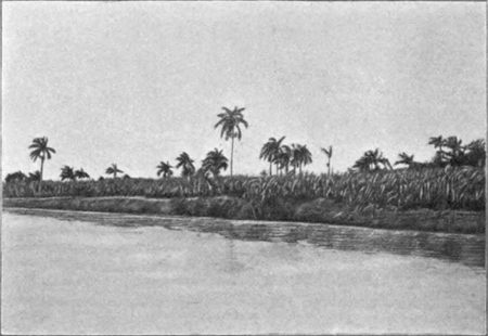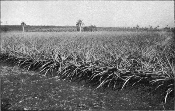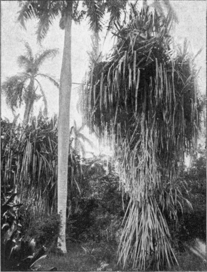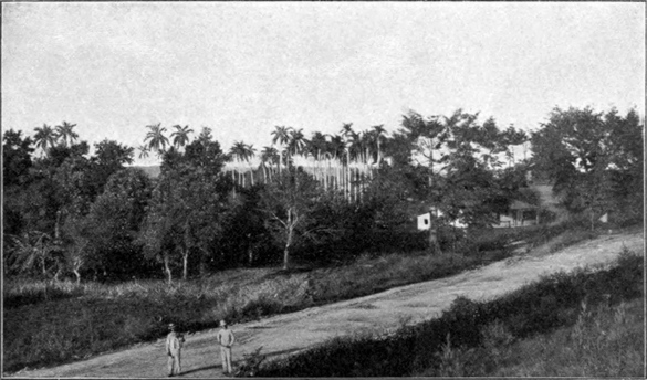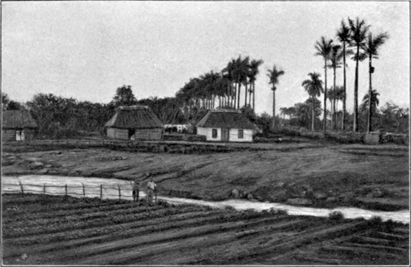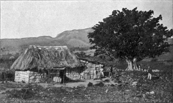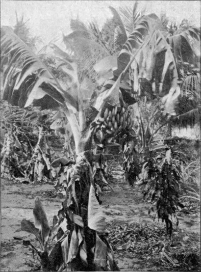 In allen Einsenkungen und Thalungen auf den höheren Terrassen und zwischen den Bergen lagert eine mehr oder minder mächtige Schicht von Roterde, die als das schließliche Verwitterungsprodukt des Kalksteins dahin geschwemmt worden ist, und vor allen Dingen: diese Roterdestrecken tragen eine artenreiche und hochstämmige tropische Vegetation. Insbesondere sind dieselben die Stätten, wo die Hauptkulturen der Gegend gedeihen: die schattigen Kokospalmenhaine (Abb. 28), die sonnigen Ananasfelder (Abb. 29), die üppigen Bananenpflanzungen (Platanales, Abb. 30) und die Kakao-, Orangen- und Mangogärten, aus denen hier und da eine leicht gebaute, von Negern oder Creolen bewohnt, Palmpfahl- und Palmstrohhütte (Bohio) hervorblickt.