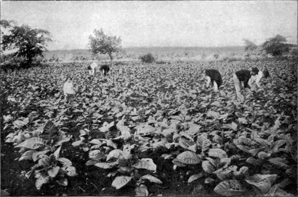 In einer Beziehung konnte Cuba freilich nicht verfehlen, seine kulturgeographische Bedeutung schon in den ersten Jahrzehnten der spanischen Herrschaft geltend zu machen: es diente sowohl den welthistorischen Unternehmungen eines Ferdinand von Cordova und Juan Grijalva (1518), sowie eines Ferdinand Cortez (1519) gegen Mexico und Mittelamerika, als auch denjenigen eines Ferdinand de Soto (1539) und eines Aviles de Menendez (1566) gegen Florida und das Mississippigebiet als Basis und Ausgangspunkt, und als ein Hauptschlüssel zu der Neuen Welt — „Llave del Nuevo Mundo“ — bewährte sich insbesondere die Position von Habana schon sehr frühe. Der von spanischen Ansiedlern betriebene Landbau beschränkte sich aber lange auf die Erzeugung der zu ihrem eigenen Lebensunterhalt nötigen Nährgewächse, und auch die Zucht der aus Europa eingeführten Nutztiere, die auf den tropischen Savannen ohne weiteres wohl gedieh, gestattete nur eine vergleichsweise unbeträchtliche Ausfuhr von Häuten und Fellen, sowie später von Honig und Wachs. Für die Erzeugnisse, durch welche die Insel nachmals so reich und berühmt geworden ist, gab es in den Zeiten, die unmittelbar auf ihre Entdeckung folgten, noch keinen genügenden Markt, und als die Nachfrage nach ihnen allgemach eine lebhaftere wurde, da hatten Haiti und Mexico betreffs ihres Anbaues und Absatzes vor Cuba lange Zeit einen weiten Vorsprung. Was insbesondere das cubanische Rauchkraut anbetrifft, so lernten die spanischen Ansiedler und Seefahrer den Genuß desselben allerdings von den Eingeborenen sehr rasch würdigen und von diesen wieder — entgegen allen Verboten, welche Könige, Kaiser und Sultane zur Bekämpfung der[S. 5] bedenklichen Neuerung erließen — die christlichen und mohammedanischen Völker der Alten Welt; der Anbau des Tabaks (Abb. 5) zu Handelszwecken begann aber auf Cuba erst gegen Ende des XVI. Jahrhunderts, und einen bedeutenderen Umfang gewann derselbe unter steten Kämpfen mit beengenden Monopolen und Regierungsmaßregeln sogar erst im Laufe des XVIII. Jahrhunderts. Die Kulturen des Zuckerrohres und des Kaffeebaumes aber, welche auf Haiti bereits in den ersten Jahrzehnten der Besiedelung in hohen Schwung kamen, wurden auf Cuba erst nach der Mitte des XVIII. Jahrhunderts nennenswert. Die cubanische Tabakausfuhr betrug um das Jahr 1700 kaum mehr als 1000 Centner jährlich, um das Jahr 1750 aber ungefähr 20000 Centner.