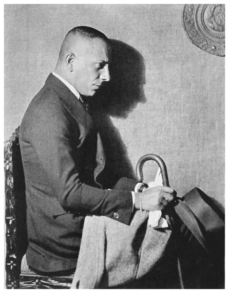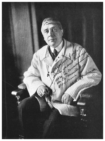 But to go back to my interview with Mr. Griffith. I met him for lunch, and I was impressed immediately by the personality which has since lifted him into his place as the greatest of screen directors. Tall and spare and quite stooped, Mr. Griffith’s figure suggests by its very lack of erectness that reserve of energy which transforms him in the studio to the tireless, almost demoniacal worker. His features are clear-cut, and to the suggestion of the eagle in his profile the clear blue eyes—eyes which you could never possibly mistake for gray even across a room—contribute a final authority. These eyes while he is at work, so people tell me, glow with enthusiasm, but during the chance interview they join with the mouth in a look of amused observation.