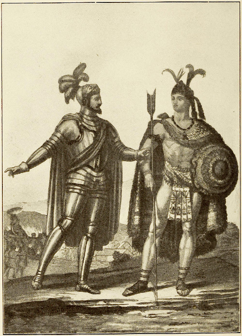 The story of the career of Hernando Cortes during his conquest of Mexico is a story of extraordinary courage, undaunted resolution, and hideous cruelty. It is a story of the subjection of a “little people,” overcome and enslaved by a superior nation, which, in its lust for gold and territorial aggrandizement, left no methods of stratagem, cunning, military science, and barbarous cruelty untried to achieve its purpose. Granted that the early Emperors of Mexico were tyrannical in their treatment of the natives and that their religious rites were accompanied by human sacrifices and cannibalism, Mexican cruelty pales before the horrible scenes enacted by so-called civilized Spain in this dreadful Mexican drama. The three principal figures are Hernando Cortes, Montezuma, and Guatemozin—Cortes, the conqueror; Montezuma, the weak-spirited Emperor, victim of his own people’s fury; Guatemozin, the patriot. Cortes was a born adventurer, and in his youth possessed of skill in all military exercises. He was a man of consummate cunning and captivating address, of soaring ambition and marked ability as an administrator and general. Apparently he never knew what it was to fear, and consequently no danger was great enough to appall him. He was so skilled in stratagem that no situation was devious enough to prevent its solution. He had the same greed of gold as all Spaniards of his day had, and no means of obtaining it were considered dishonorable as long as they were successful. But courageous, resolute, and ambitious as Cortes was, he will go down through the ages branded with infamy for his treatment of Montezuma, for the frightful massacres at Cholula and Otumba, for his execution of Guatemozin, last of the Aztec Emperors, for the burning of caciques and chiefs which he ordered, and for the countless atrocities of his men which he permitted. In his old age, like Columbus, he suffered from the neglect of an ungrateful Court, but, while we can sympathize with Columbus in that situation, we can feel no sympathy for Cortes as we recall the black chapters of his career.