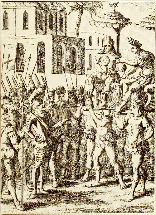 Grijalva resumed cruising along the coast. He was astonished everywhere at the sight of villages or towns with houses made of stone and cement, which in passing appeared to the Spaniards finer and better built then they really were. The resemblance between this region and Spain seemed so close to them that they gave it the name of New Spain—a name which it retains to this day. Next they came to the mouth of a river, called by the natives Tabasco, but the Spaniards named it Grijalva, in honor of their leader. The whole region roundabout had such a flourishing appearance and seemed to be populated so densely that Grijalva could not resist the desire to obtain accurate information about it. So he went ashore with his entire armed force. There he encountered a multitude of armed Indians, who with terrible outcries sought to prevent their further advance. But he paid no attention to their menaces, marched up to a bowshot’s distance from them, then halted, drew his men up in battle order, and sent the two Americans, Julian and Melchior, who had been taken by Hernandez, to inform them that he had not come there to injure them, but to do them good, and that he was anxious to make a peaceful agreement with them.