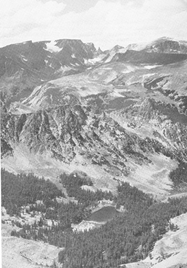 Abruptly the highway leaves the creek and turns up the north slope of Beartooth Plateau, and over easy grades zigzags its sinuous way into Wyoming and the Shoshone National Forest and to the very “top of the world.” Once on top a breath-taking panorama unexpectedly unfolds before the astonished traveler. Vision is practically unrestricted in any direction because the road is well above timberline. To the east lies the Big Horn Basin, with the Big Horn Mountains in the background; to the south is the Clarks Fork Valley, Sunlight Basin, and still further south the North Fork and South Fork valleys of the Shoshone. As far as one can see, rugged snowcapped mountains pierce the sky. In the west, Pilot Peak and its Siamese twin, Index Peak, point the way into the heavens. To the north is a continuation of Beartooth Plateau into the Custer Forest which contains grasshopper glaciers and the “land of the red snows.” Everywhere evidences of glaciation and tremendous expanses of barren rock are to be seen. Snowbanks are common. Numerous lakes of various sizes nestle in the pockets of the land. Gradually, as the traveler goes westward, he descends to timberline, where gnarled, stunted trees carry on an age-old struggle for existence against the fierce elements of cold driving snows and terrific winds. Further westward as altitude is lost the timber becomes taller, until as one nears the Clarks Fork River dense, thrifty stands are the rule.