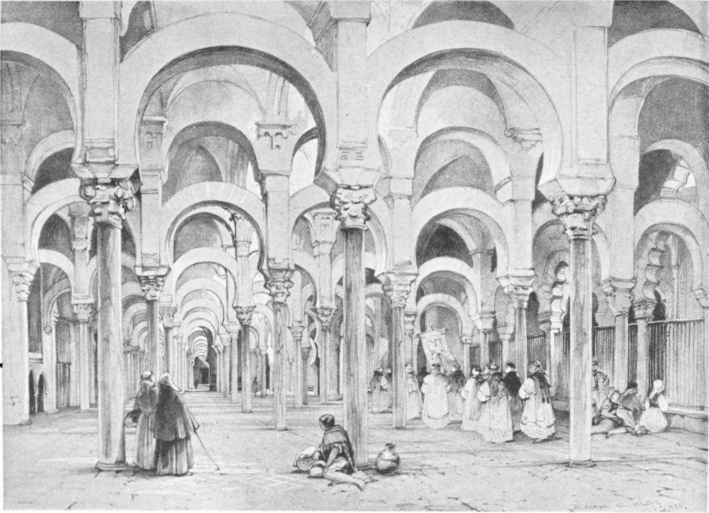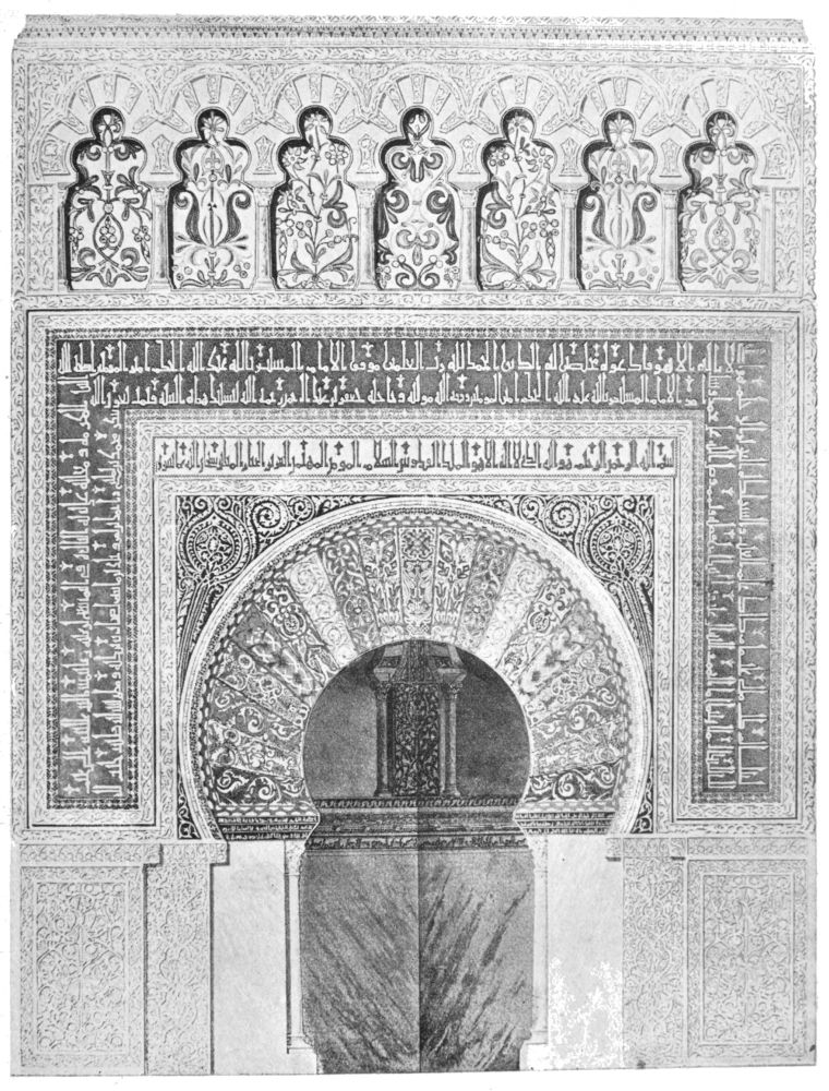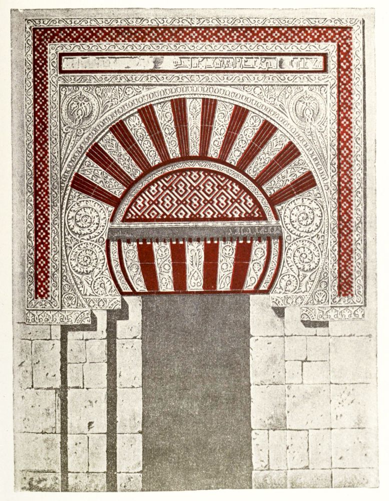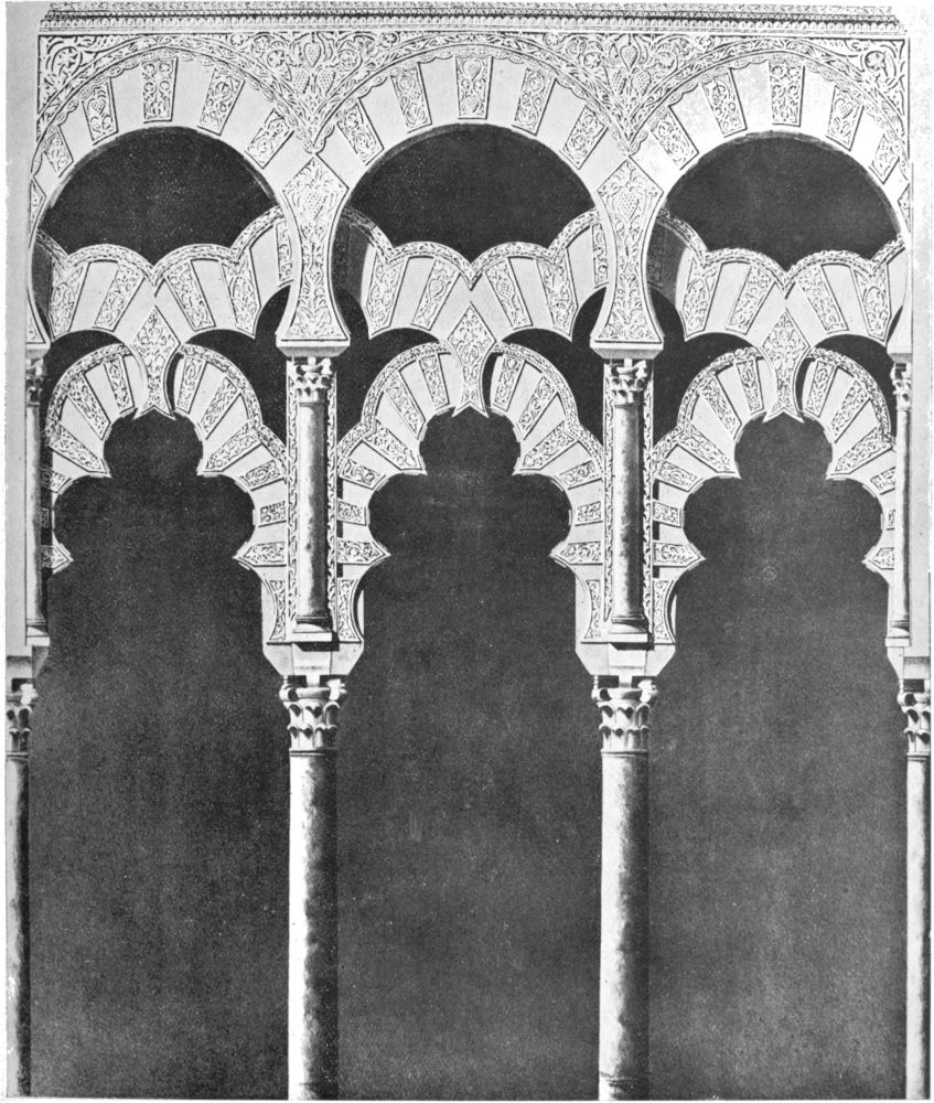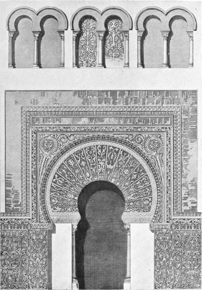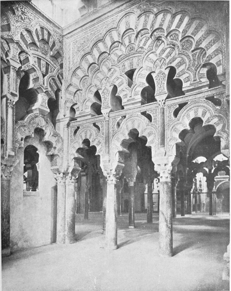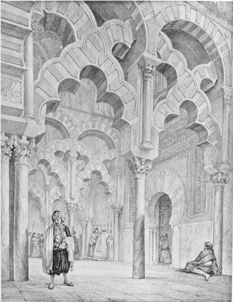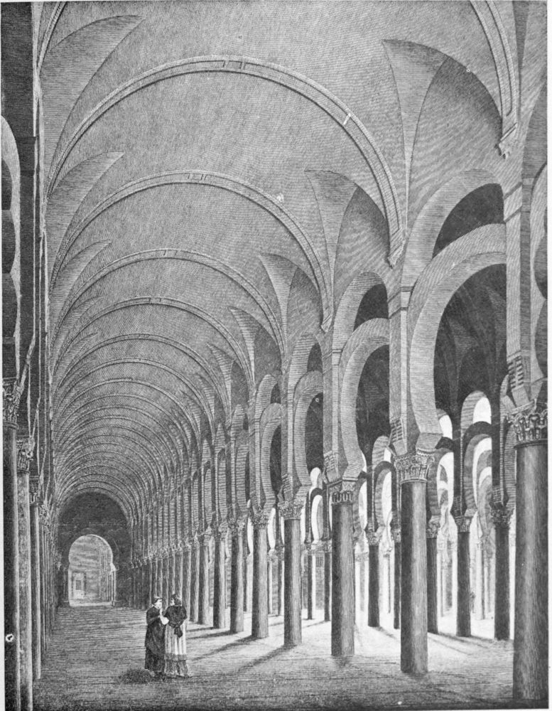 The great Aljama was completed in the year A.D. 793. The Emir Hisham took as great a personal interest in its progress as did his father, the walies of the provinces contributed to its decoration with the spoils from ancient monuments, the artificers with their genius, victors with their booty, the city with its workmen, the mountains of{54} Cordova and Cabra by yielding the treasures of their quarries, Africa with the trunks of its imperishable larch-pines, and Asia by inoculating the growing Arabic-Spanish art with its genius of ornament, its aspirations and its poetry.