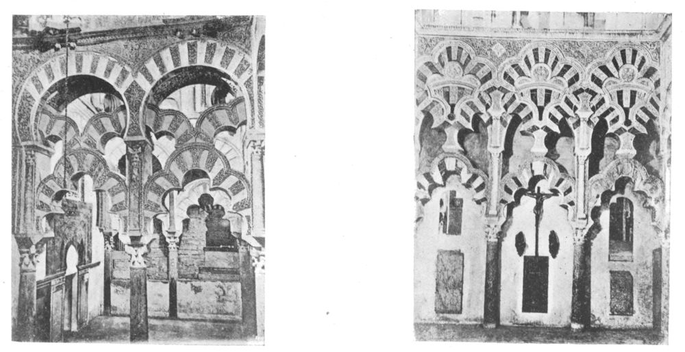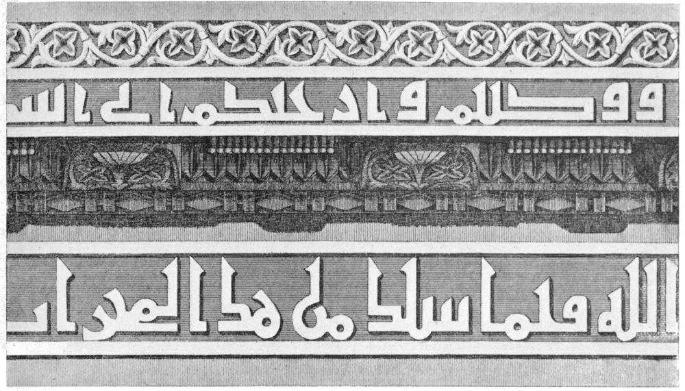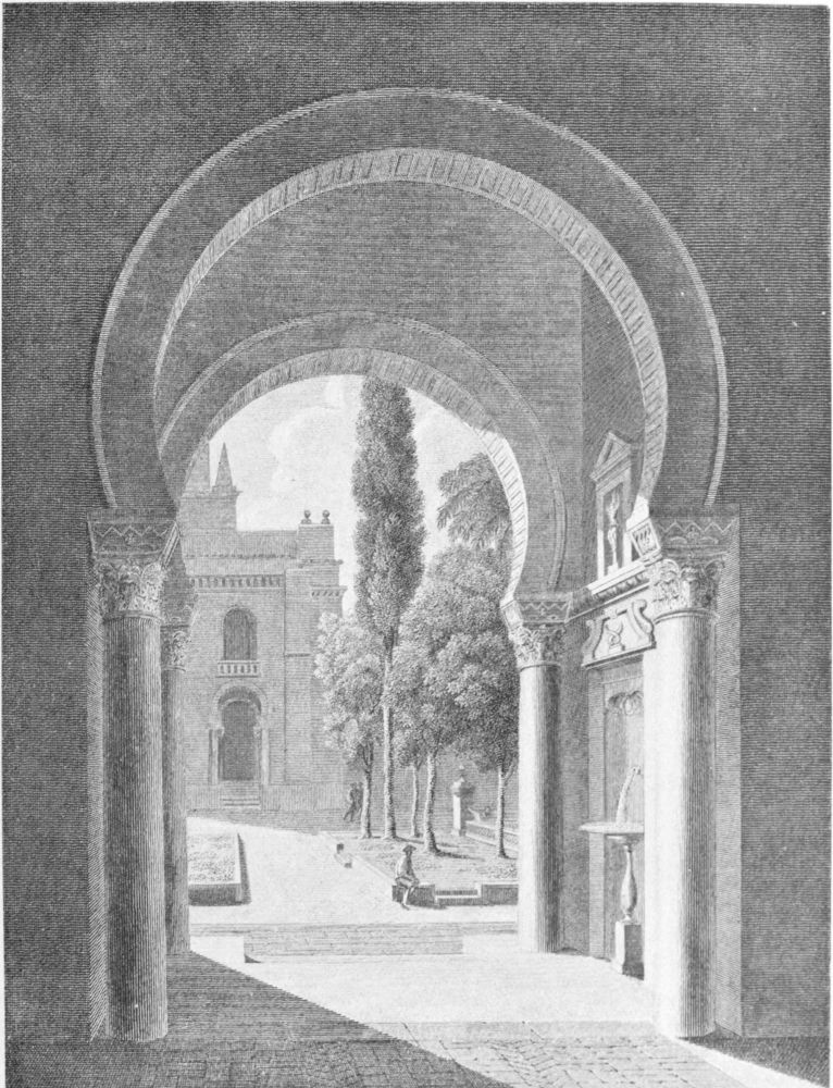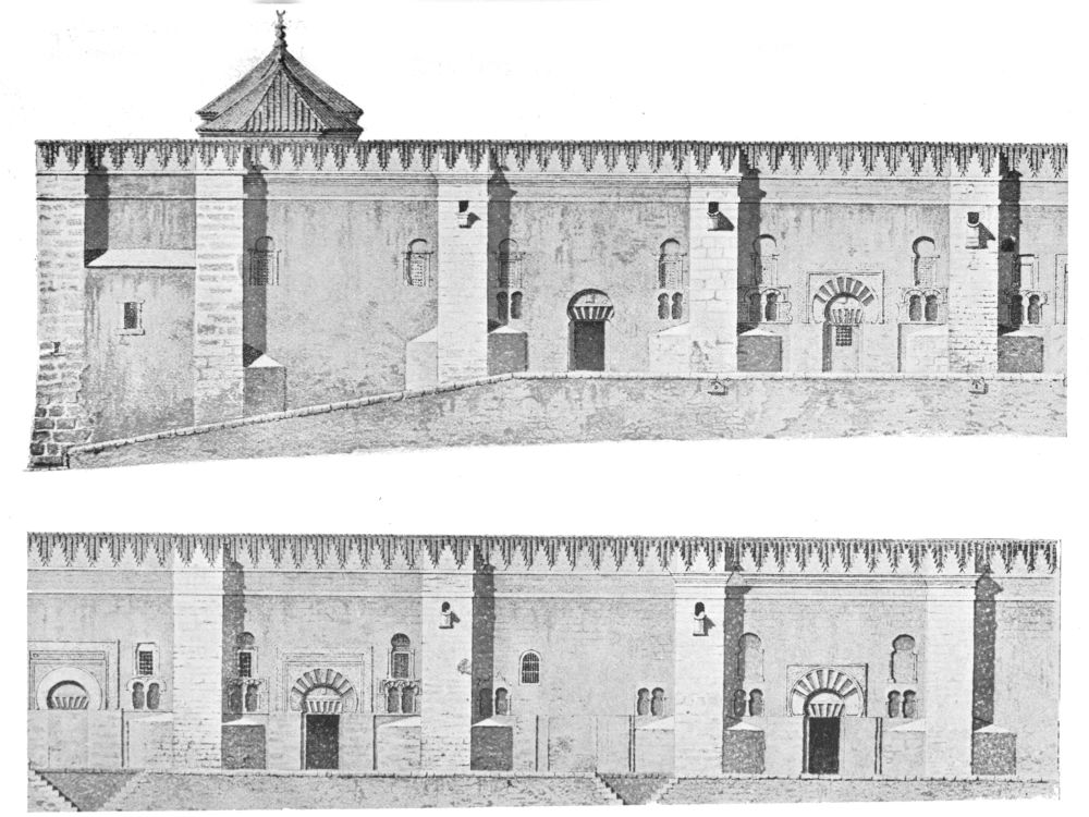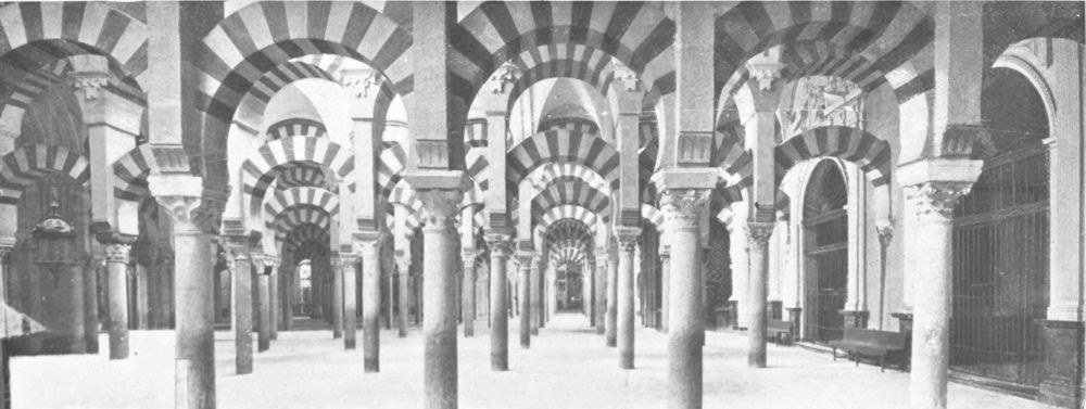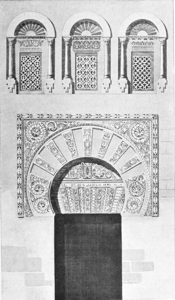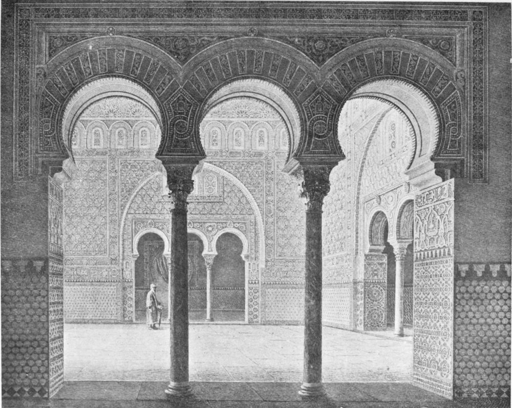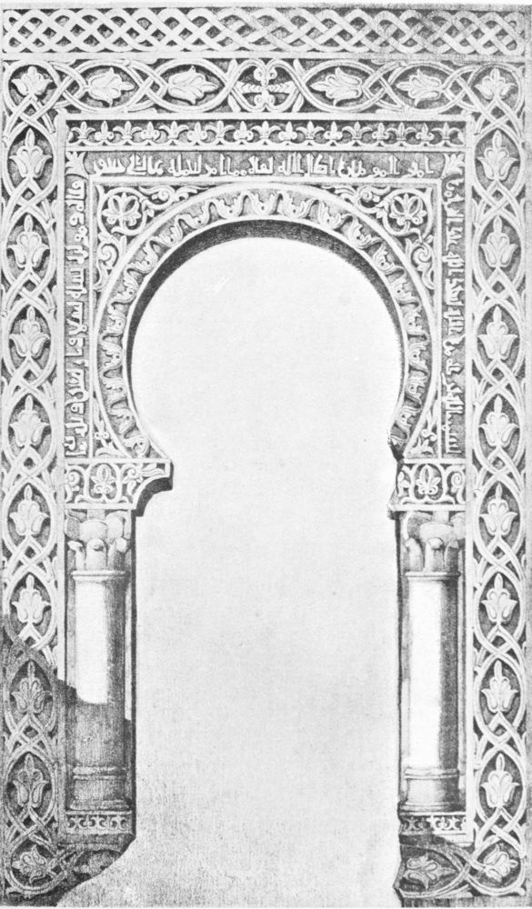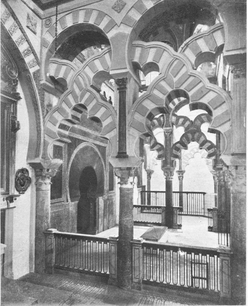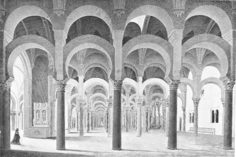 The great Aljama was completed in the year A.D. 793. The Emir Hisham took as great a personal interest in its progress as did his father, the walies of the provinces contributed to its decoration with the spoils from ancient monuments, the artificers with their genius, victors with their booty, the city with its workmen, the mountains of{54} Cordova and Cabra by yielding the treasures of their quarries, Africa with the trunks of its imperishable larch-pines, and Asia by inoculating the growing Arabic-Spanish art with its genius of ornament, its aspirations and its poetry.