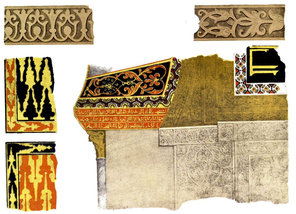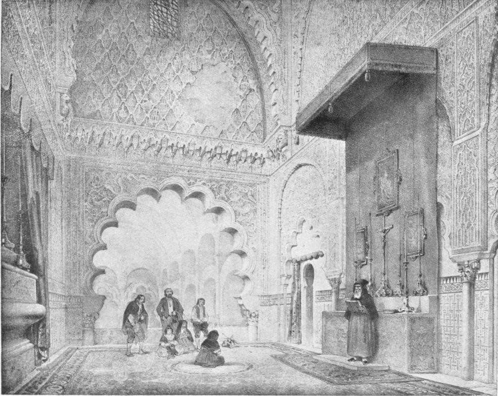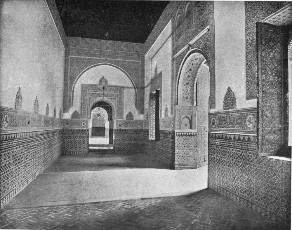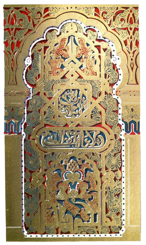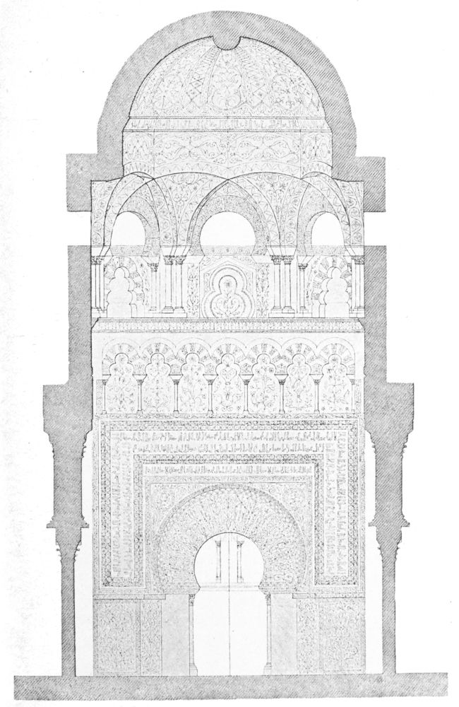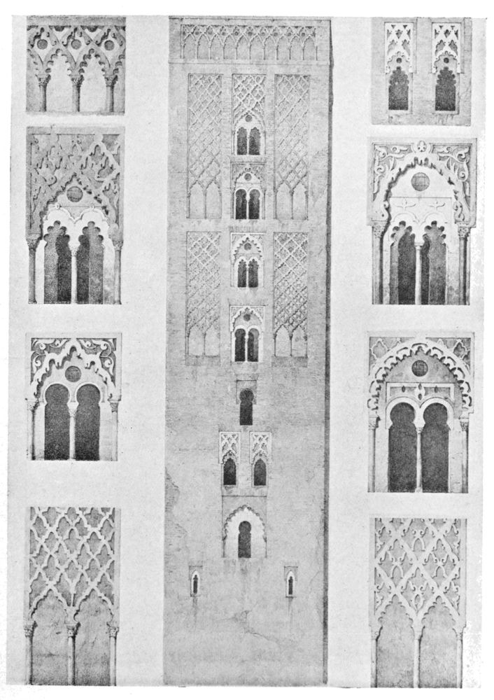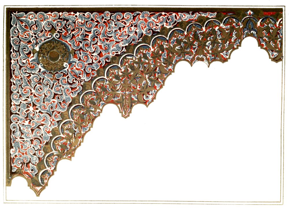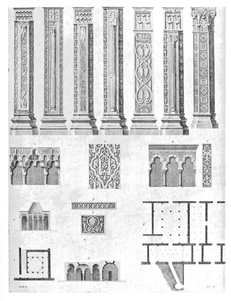 The great Aljama was completed in the year A.D. 793. The Emir Hisham took as great a personal interest in its progress as did his father, the walies of the provinces contributed to its decoration with the spoils from ancient monuments, the artificers with their genius, victors with their booty, the city with its workmen, the mountains of{54} Cordova and Cabra by yielding the treasures of their quarries, Africa with the trunks of its imperishable larch-pines, and Asia by inoculating the growing Arabic-Spanish art with its genius of ornament, its aspirations and its poetry.