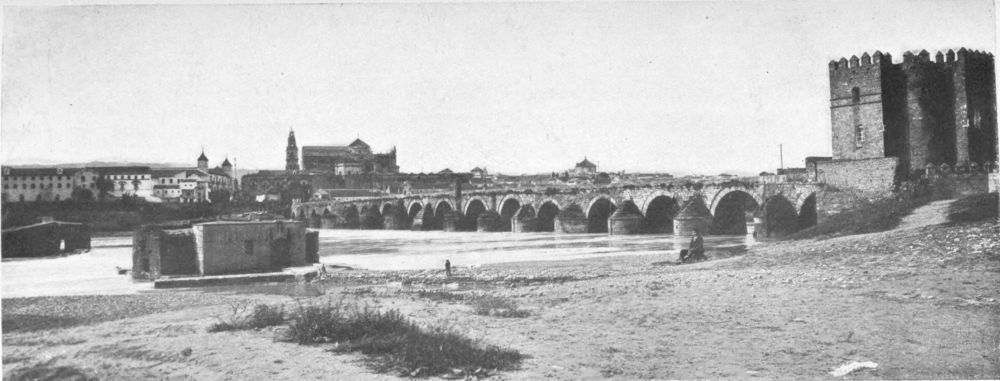 OF the four great cities of the Mohammedan domination in Spain, Cordova, as the seat of the Khalifate established by Abd-er-Rahman I., is rightly regarded as chief. The sun of the Moslem era shone with dazzling brilliance on Seville, and pierced the shadows of grim Toledo ere it set upon the decaying grandeur of Granada; but it had risen first on Cordova, and from “that abode of magnificence, superiority, and elegance” its glory had been reflected to the furthest corner of the civilised world. For Cordova, by reason of its climate, its situation, and its surroundings has, since the beginning of time, been one of the garden spots of Europe. The Carthaginians had aptly styled it “the Gem of the South,” and the Romans had founded a city there in 152 B.C., which they called Corduba. But Corduba had sided with Pompey against Cæsar in the struggle for the mastership of the Roman Empire, and the mighty Julius visited this act of hostility with the destruction of more than half the city, and the massacre of 28,000 of its inhabitants. When the Goths made themselves rulers of Spain in the sixth century, they selected Toledo to be their capital, and Cordova sank into political insignificance. In 711, when Tarik had defeated Roderick near the banks of the Guadalete, he despatched Mughith with 700 horse to seize Cordova. Taking advantage of a fortuitous storm of hail, which deadened the clatter of the horses’ hoofs, and assisted by{36} the treachery of a Christian shepherd, the followers of the Prophet obtained an unopposed entry, and the city fell without a blow being struck. Forty-four years later Abd-er-Rahman I. established the dynasty of the Omeyyads of Cordova, and for three centuries the capital of Mohammedan Spain was to be, in the language of the old chronicler, Ash-Shakand, “the repository of science, the minaret of piety and devotion, unrivalled even by the splendours of Baghdad or Damascus.”