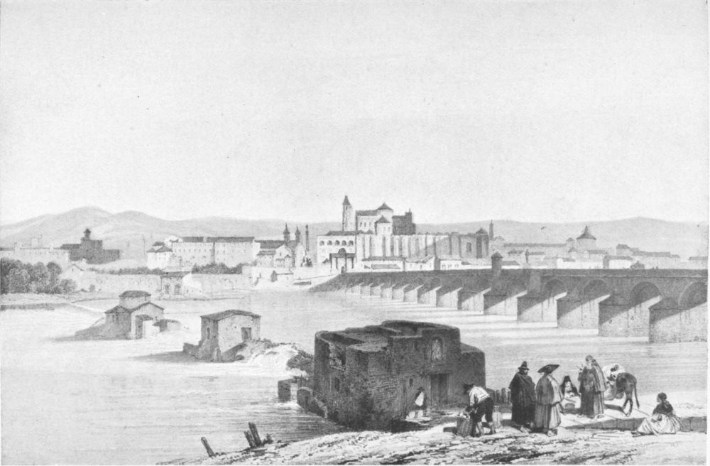 Tradition relates that there formerly was a bridge over the Guadelquivir, erected on the site of the present structure, about 200 years before the arrival of the Moors in Spain: but, this edifice being greatly decayed, it was rebuilt by the Arabs during the Viceroyship of Assamh, A.D. 720 or 721. This noble structure is four hundred paces, or one thousand feet, in length, and its breadth is twenty-two feet eight inches within the parapets. The passage over the bridge is a straight line from one end to the other; the arches are sixteen in number, and the buttresses of the piers are much stronger and better adapted for similar purposes than the modern tri-lateral cut-waters. Nearly eleven centuries have these buttresses withstood the rapid floods of the Guadelquivir, without sustaining any material injury. Although Hisham practically rebuilt the bridge, the labour did not contribute to his personal convenience. His great love of hunting caused the malcontents among his subjects to whisper that he had repaired the bridge to facilitate the outgoings and incomings of his hunting parties. The rumour reached the king, who vowed that he would never cross the bridge again—a vow he faithfully observed.