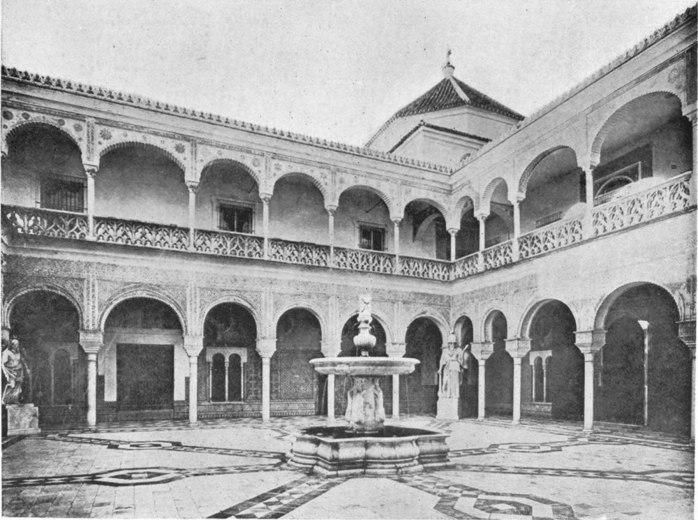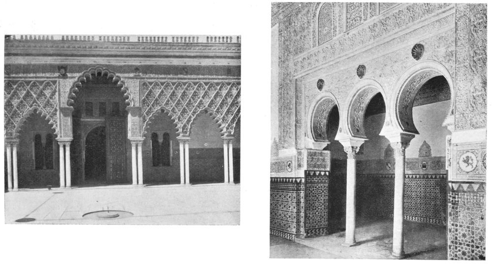 In Seville, on the spot where Roman, Visigoth, and Moslem have each in turn practised their faith, the Cathedral bells now hang above the Arabian tower of the mosque, and the spire of the temple of the faithful has become the world-famous Giralda, which dominates the city. Moorish fountains and patios are found at Malaga, and Granada, and Toledo, but one comes to “La Tierra de Maria Santisima” to see them at their loveliest, while the Alcazar is perhaps the best preserved and most superbly-decorated specimen of the Moorish citadel-palace that Europe has to show.