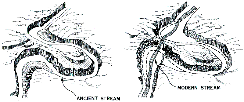 This frequently gave rise to blocks of solid rock, called “fins” and “necks,” standing between entrenched meanders. It was one of these “necks” from which Rainbow Bridge was formed.