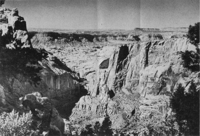 Across a scrub juniper (cedar) flat, and down into the last canyon they went. This was Nonnezoshi Biko, the Indian guide’s name for the canyon of the great stone arch, or Rainbow Bridge Canyon of the present.