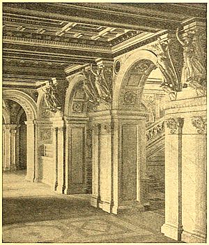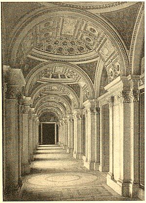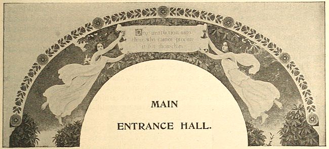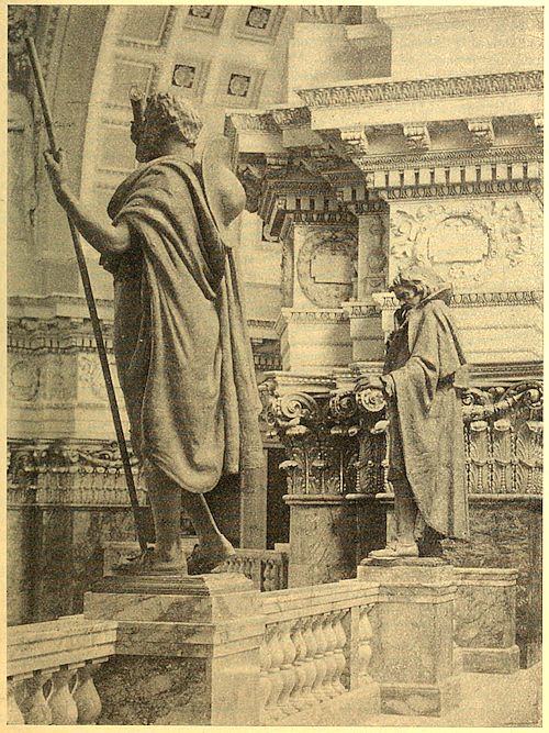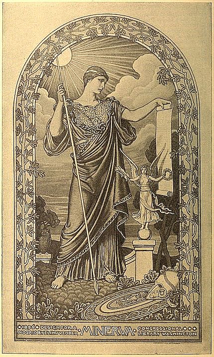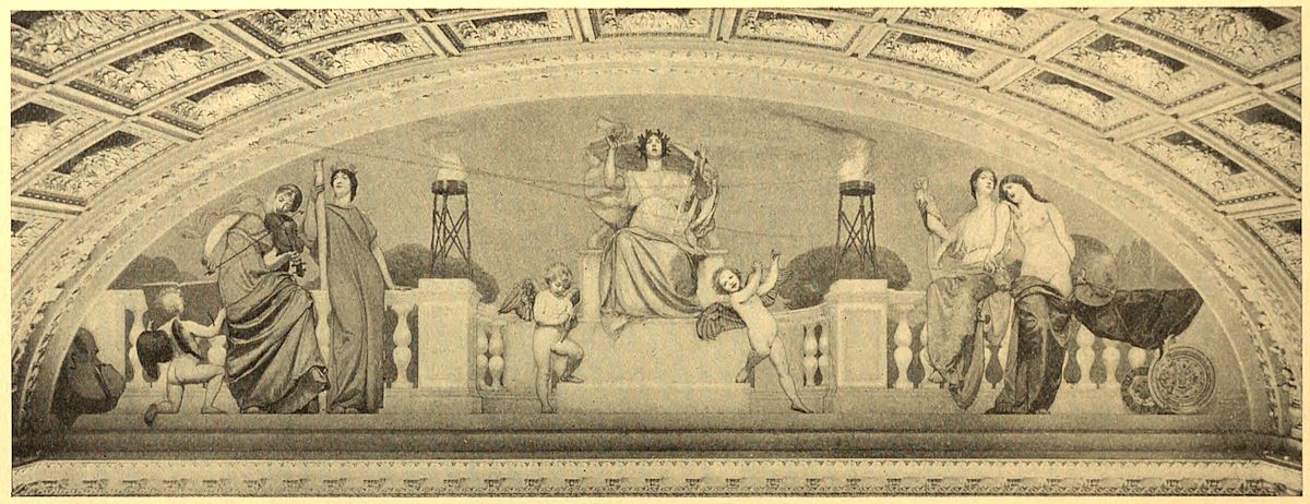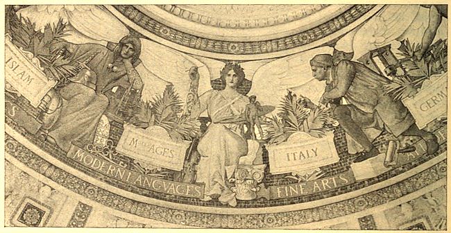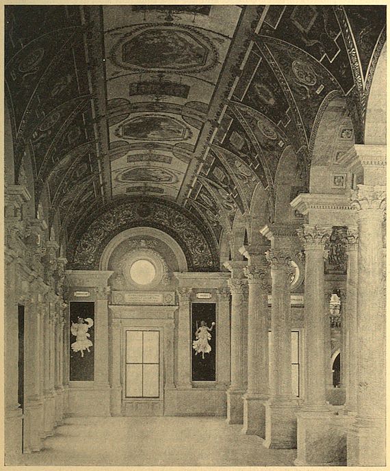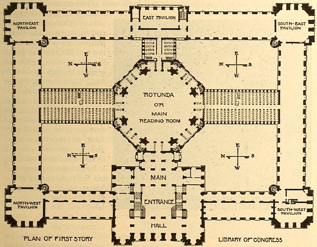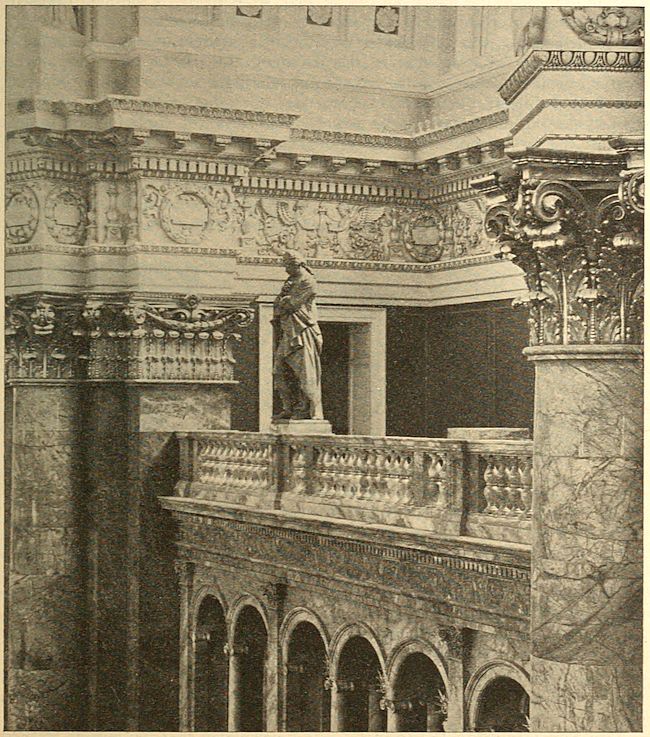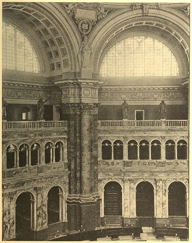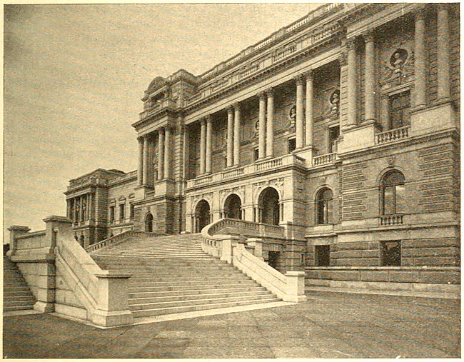 The intention of this Handbook is to furnish such an account of the new building of the Library of Congress as may prove of interest to the general reader, and at the same time serve as a convenient guide to actual visitors. To this latter end, a system of headings and sub-headings has been introduced, and the building has been described throughout in the order in which a visitor might naturally walk through it. Criticism has been avoided in the general description, but a brief survey of the artistic qualities of the Architecture, Sculpture, and Painting is given in Mr. Caffin’s supplementary essay.