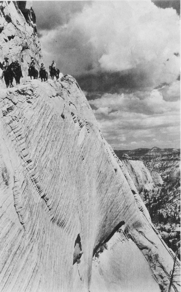 Saddle horses may be hired in the park by the hour or day. Escorted trips to the East or West Rim of Zion Canyon are made daily. Escorted half-day horseback trips to The Narrows or Angels Landing may be enjoyed, and special guide service, when available, may be obtained for a day, a half day, or less. Riding outfits for women may be rented at the lodge.