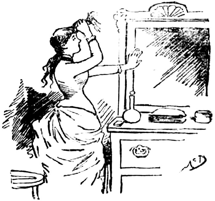 The weather was not cold; but, nevertheless, when I thought of what was to come, wintery chills ran races up and down my back in very mockery of the perspiration which was slowly but surely taking the curl out of my bangs. Between times, practicing before the mirror and picturing my future as a lunatic, I read snatches of improbable and impossible ghost stories, so that when the dawn came to chase away the night, I felt that I was in a fit mood for my mission, yet hungry enough to feel keenly that I wanted my breakfast. Slowly and sadly I took my morning bath and quietly bade farewell to a few of the most precious articles known to modern civilization. Tenderly I put my tooth-brush aside, and, when taking a final rub of the soap, I murmured, “It may be for days, and it may be—for longer.” Then I donned the old clothing I had selected for the occasion. I was in the mood to look at everything through very serious glasses. It’s just as well to take a last “fond look,” I mused, for who could tell but that the strain of playing crazy, and being shut up with a crowd of mad people, might turn my own brain, and I would never get back. But not once did I think of shirking my mission. 10Calmly, outwardly at least, I went out to my crazy business.