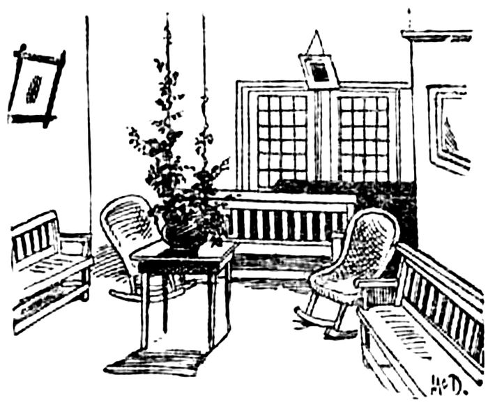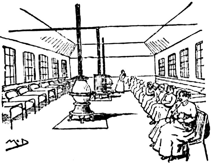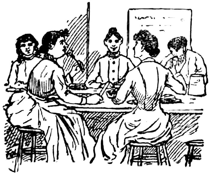 When the supper-bell rang I went along with the others to the basement and partook of the evening meal, which was similar to dinner, except that there was a smaller bill of fare and more people, the women who are employed outside during the day having returned. After the evening meal we all adjourned to the parlors, where all sat, or stood, as there were not chairs enough to go round.