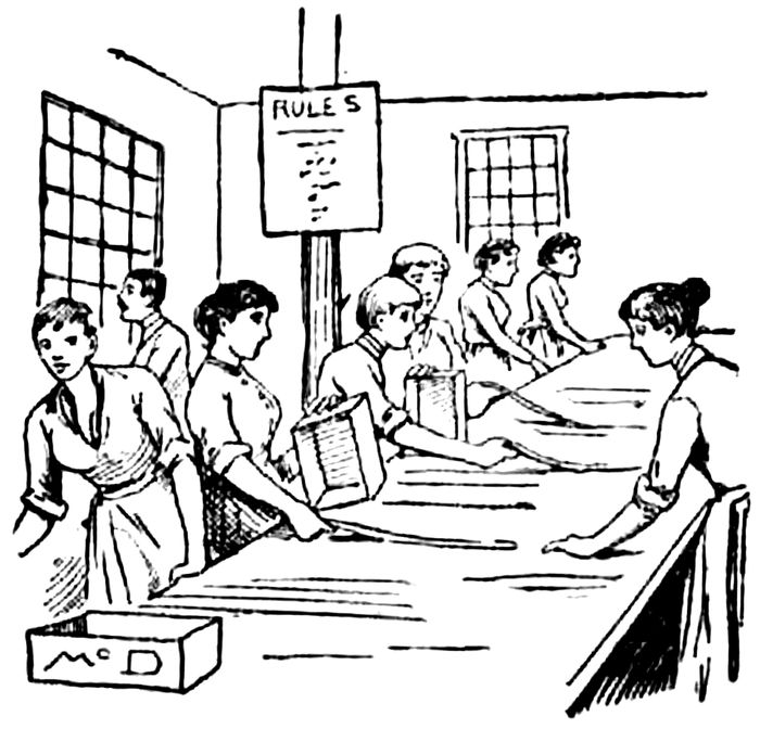 One did nothing but read and scratch her head and occasionally call out mildly, “Georgie,” without lifting 14her eyes from her book. “Georgie” was her over-frisky boy, who had more noise in him than any child I ever saw before. He did everything that was rude and unmannerly, I thought, and the mother never said a word unless she heard some one else yell at him. Another woman always kept going to sleep and waking herself up with her own snoring. I really felt wickedly thankful it was only herself she awakened. The majority of the women sat there doing nothing, but there were a few who made lace and knitted unceasingly. The enormous door-bell seemed to be going all the time, and so did the short-haired girl. The latter was, besides, one of those girls who sing all the time snatches of all the songs and hymns that have been composed for the last fifty years. There is such a thing as martyrdom in these days. The ringing of the bell brought more people who wanted shelter for the night. Excepting one woman, who was from the country on a day’s shopping expedition, they were working women, some of them with children.
