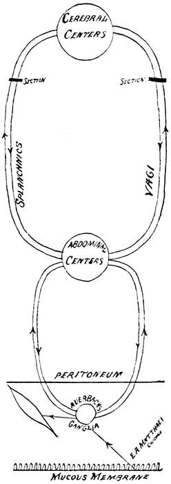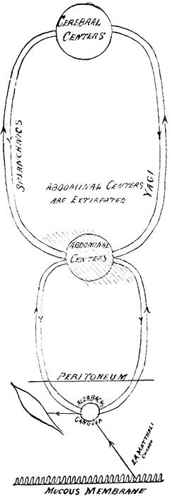 (1) Exclude the cerebral centres by cutting the vagi and splanchnics. This is shown in the schematic drawing Fig. 5, in which, for 198simplicity, one circle represents all the centres in that location. It must not be forgotten that cutting splanchnics affects the intestinal vessels. It is evident that after cutting the vagi and splanchnics the cerebral centres can have no influence on the intestines. After cutting these nerves, give the cathartic: