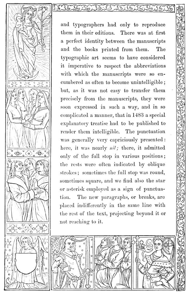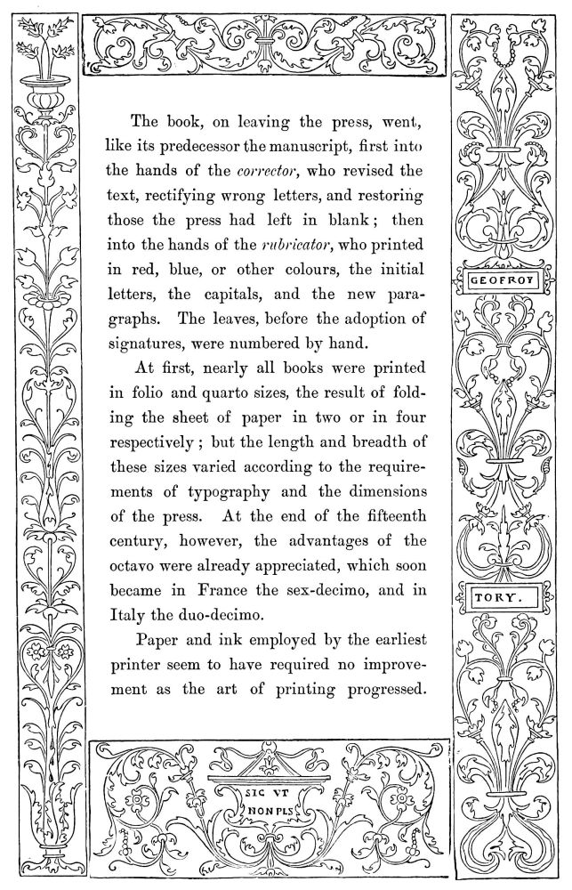 | Who was the Inventor of Printing?—Movable Letters in ancient Times.—Block Printing.—Laurent Coster.—Donati and Specula.—Gutenberg’s Process.—Partnership of Gutenberg and Faust.—Schœffer.—The Mayence Bible.—The Psalter of 1457.—The “Rationale” of 1459.—Gutenberg prints by himself.—The “Catholicon” of 1460.—Printing at Cologne, Strasbourg, Venice, and Paris.—Louis XI. and Nicholas Jenson.—German Printers at Rome.—Incunabula.—Colard Mansion.—Caxton.—Improvement of Typographical Processes up to the Sixteenth Century. | ||