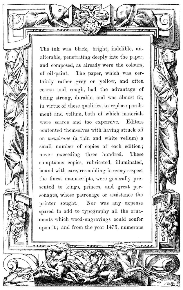 All the Arts are interesting in themselves. Their productions awaken attention and excite curiosity. But here it is not one Art only that is treated of. We pass in review all the Arts, starting from the fourth century to the second half of the sixteenth—Architecture raising churches and abbeys, palaces and public memorials, strong fortresses and the ramparts of cities; Sculpture adorning and perfecting other Arts by its works in stone, marble, bronze, wood, and ivory; Painting, commencing with mosaic and enamels, contributing to the decoration of buildings jointly with stained glass and frescoes, embellishing and illuminating manuscripts before it arrived at its highest point of perfection, with the Art of Giotto and Raphael, of Hemling and Albert Dürer; Engraving on wood and metal, with which is associated the work of the medallist and the goldsmith; and after attempting to touch upon Playing-cards and Niello-work, we suddenly evoke that sublime invention destined to change the face of the world—Printing. Such are, in brief, some of the principal features of this splendid picture. One can imagine what an infinity, what variety and richness, of details it should contain.