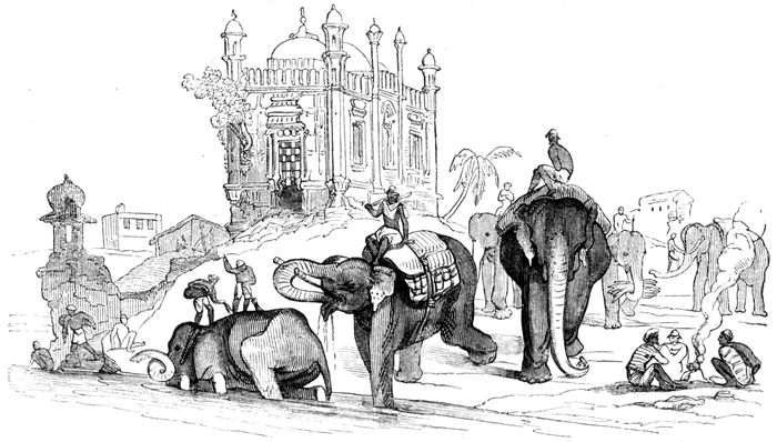 The Water Gate of Fort William is now before you, and the horsemen are on the Esplanade,—a road extending by the river side, from Chandpaul Ghāt, to Garden Reach. This is the favourite ride and drive, during the early morning and in the cool of the evening, of all the inhabitants of Calcutta. A dinghī, a native boat covered with matting, is going up the river, filled with gharas, or jars of coarse, red earthenware, used for holding water.